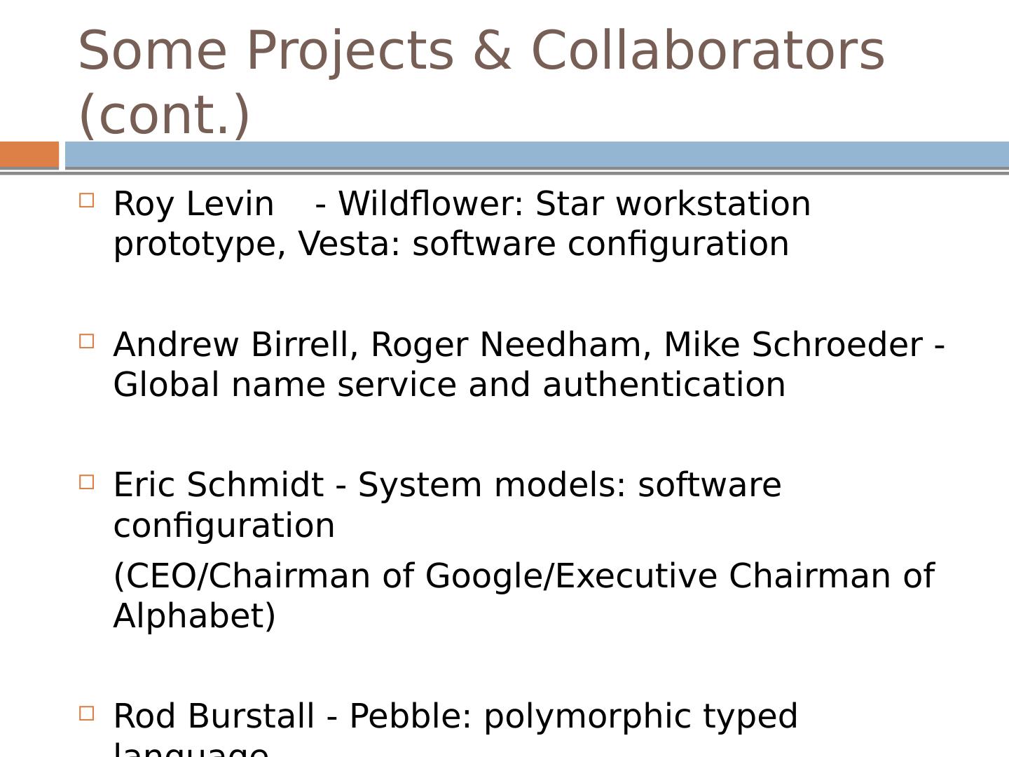 21 .Some Projects & Collaborators (cont.) Roy Levin - Wildflower: Star workstation prototype, Vesta : software configuration Andrew Birrell , Roger Needham, Mike Schroeder - Global name service and authentication Eric Schmidt - System models: software configuration (CEO/Chairman of Google/Executive Chairman of Alphabet) Rod Burstall - Pebble: polymorphic typed language