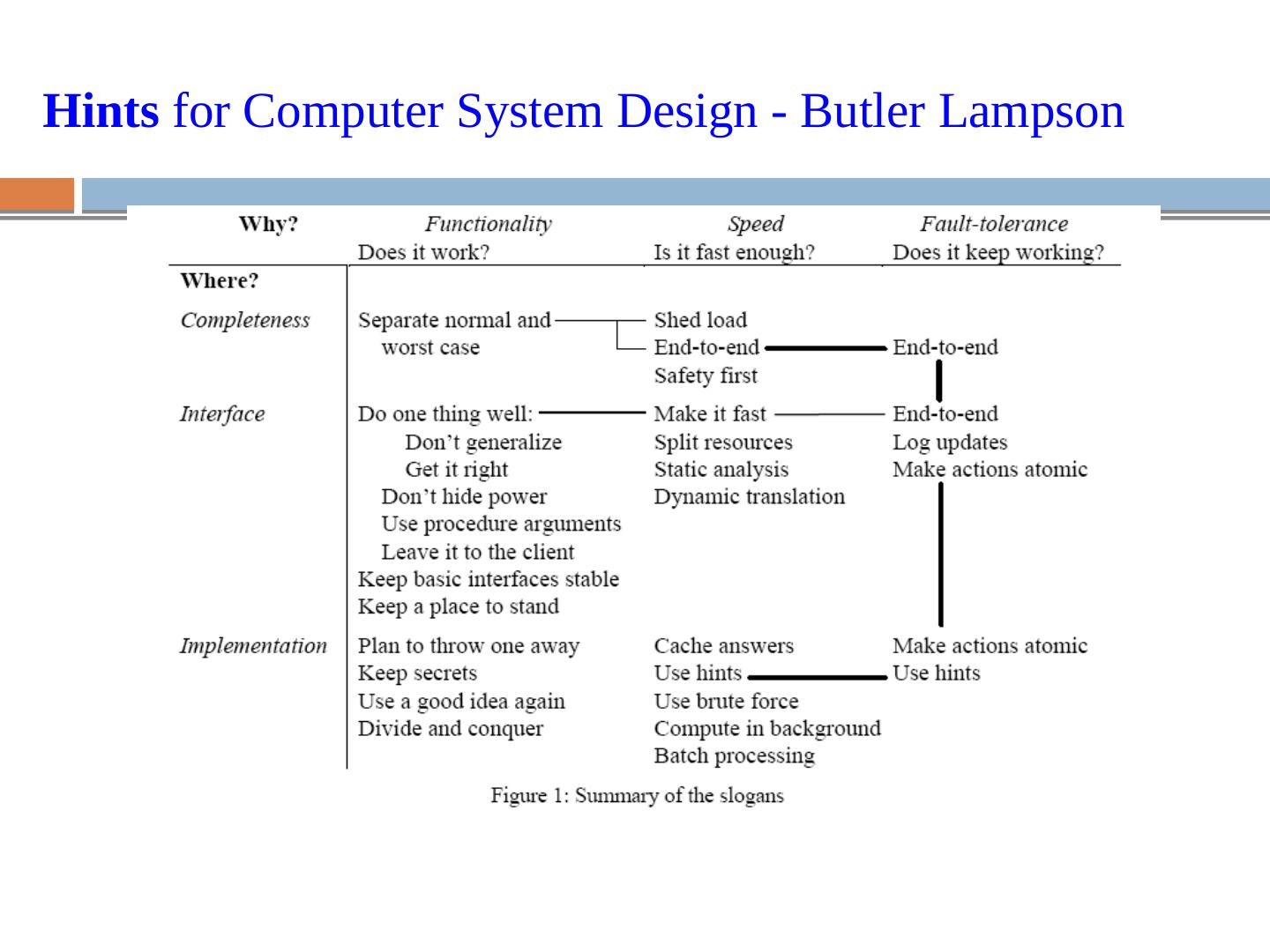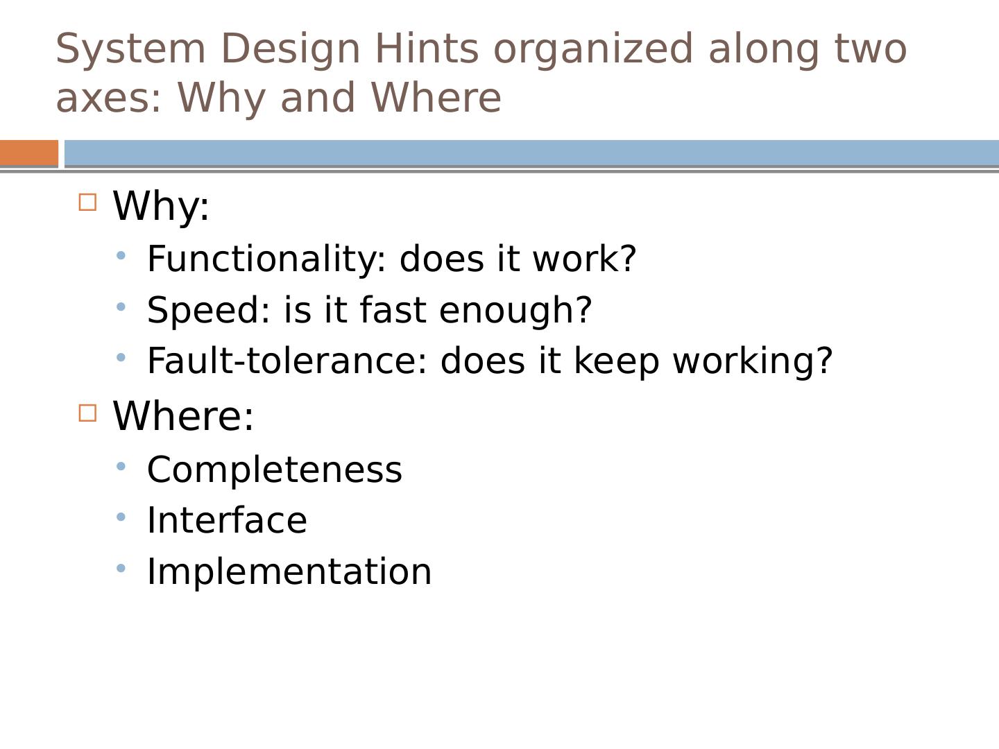 22 .System Design Hints organized along two axes: Why and Where Why: Functionality: does it work? Speed: is it fast enough? Fault-tolerance: does it keep working? Where: Completeness Interface Implementation