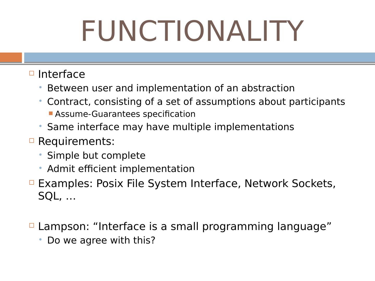 24 .FUNCTIONALITY Interface Between user and implementation of an abstraction Contract, consisting of a set of assumptions about participants Assume-Guarantees specification Same interface may have multiple implementations Requirements: Simple but complete Admit efficient implementation Examples: Posix File System Interface, Network Sockets, SQL, … Lampson: “Interface is a small programming language” Do we agree with this?
