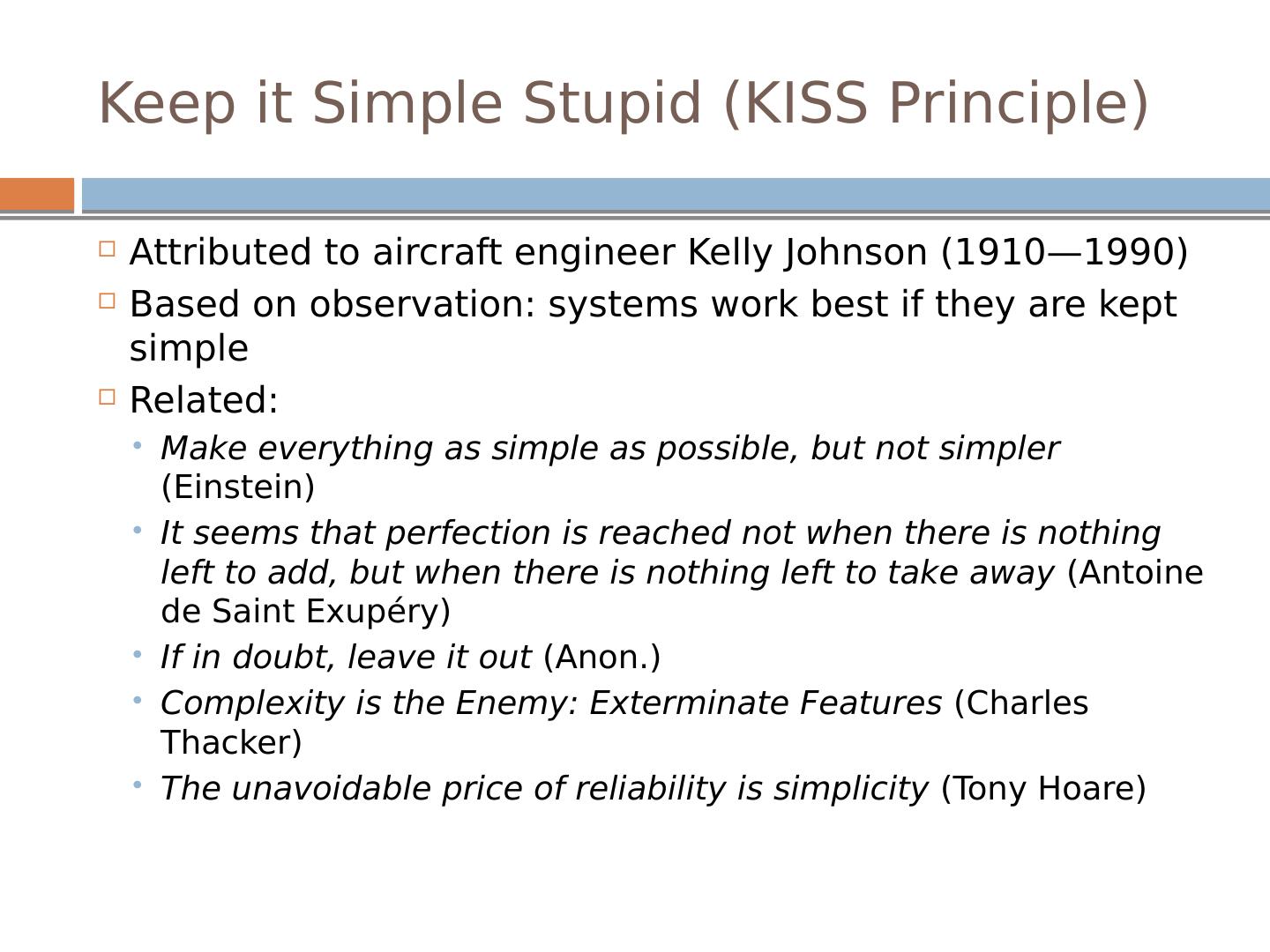 25 .Keep it Simple Stupid (KISS Principle) Attributed to aircraft e ngineer Kelly Johnson (1910—1990) Based on observation: systems work best if they are kept simple Related: Make everything as simple as possible, but not simpler (Einstein) It seems that perfection is reached not when there is nothing left to add, but when there is nothing left to take away (Antoine de Saint Exupéry ) If in doubt, leave it out (Anon.) Complexity is the Enemy: Exterminate Features (Charles Thacker) The unavoidable price of reliability is simplicity (Tony Hoare)