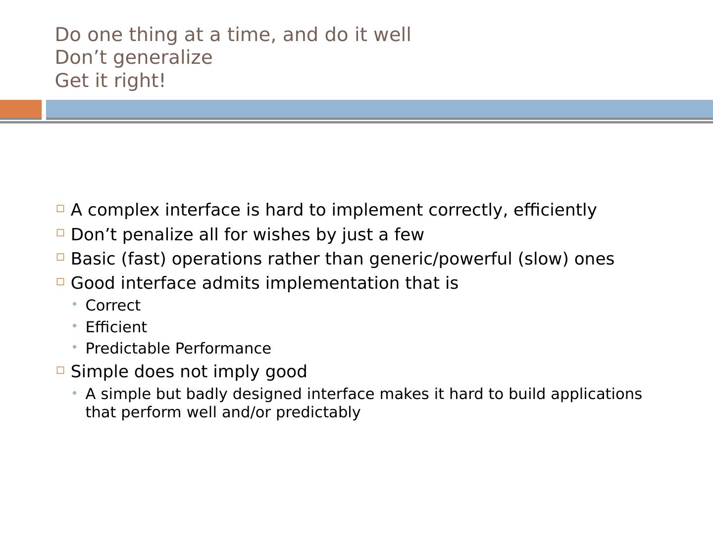 26 .Do one thing at a time, and do it well Don’t generalize Get it right! A complex interface is hard to implement correctly, efficiently Don’t penalize all for wishes by just a few Basic (fast) operations rather than generic/powerful (slow) ones Good interface admits implementation that is Correct Efficient Predictable Performance Simple does not imply good A simple but badly designed interface makes it hard to build applications that perform well and/or predictably