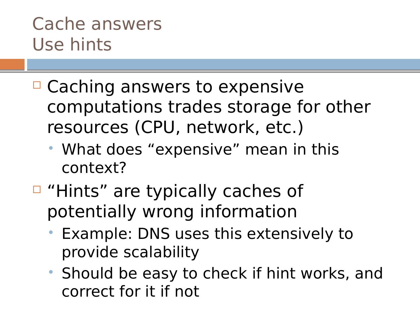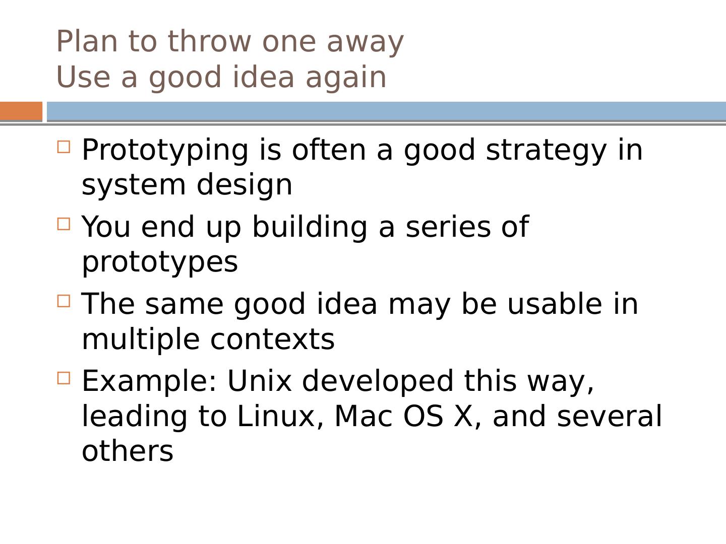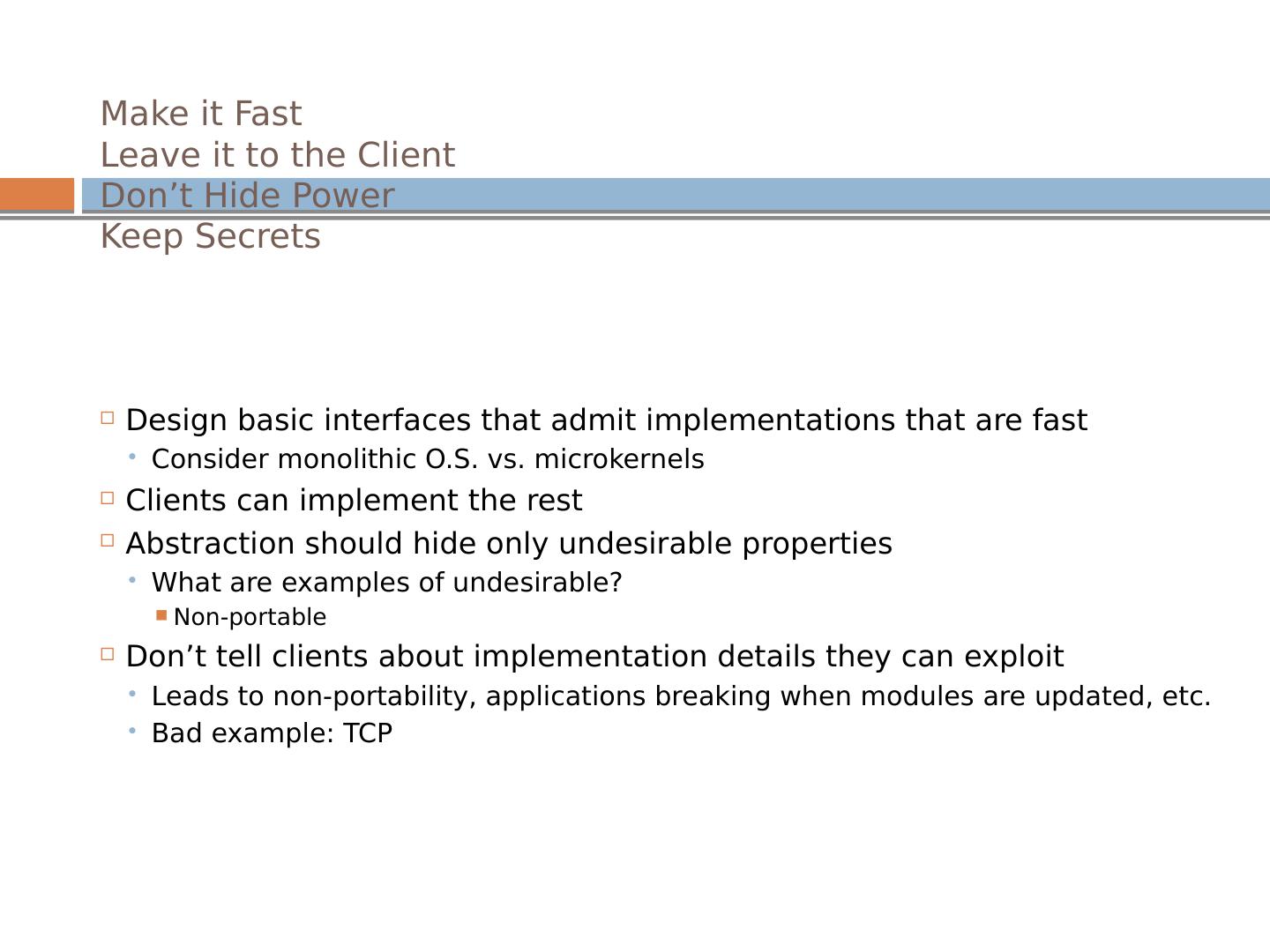 27 .Make it Fast Leave it to the Client Don’t Hide Power Keep Secrets Design basic interfaces that admit implementations that are fast Consider monolithic O.S. vs. microkernels Clients can implement the rest Abstraction should hide only undesirable properties What are examples of undesirable? Non-portable Don’t tell clients about implementation details they can exploit Leads to non-portability, applications breaking when modules are updated, etc. Bad example: TCP