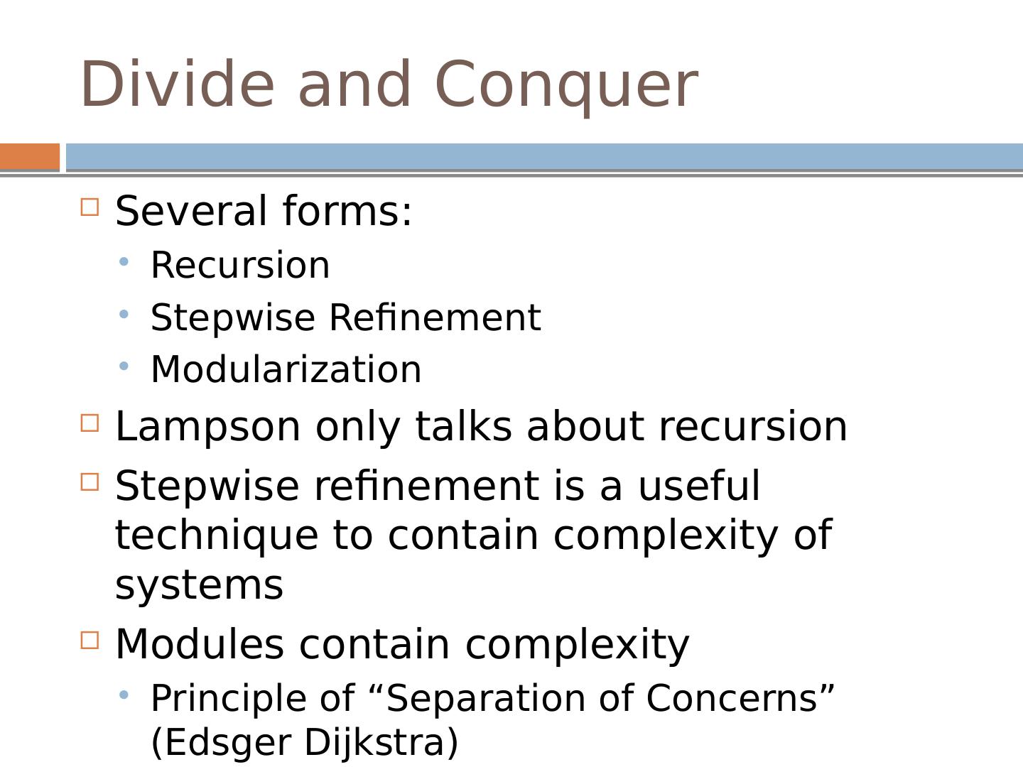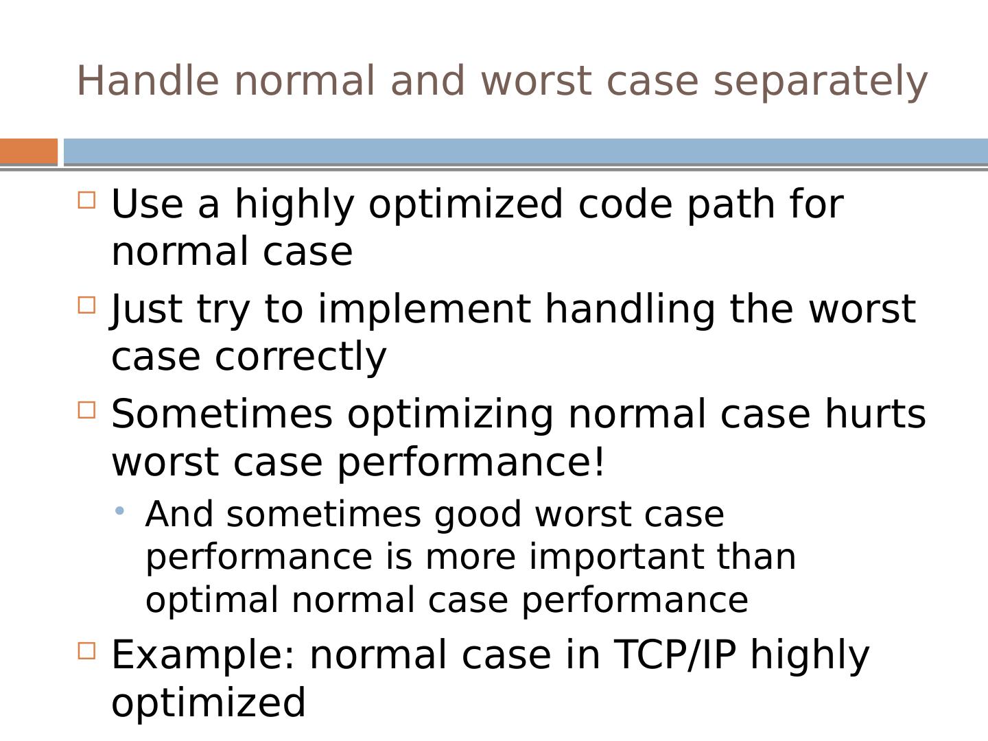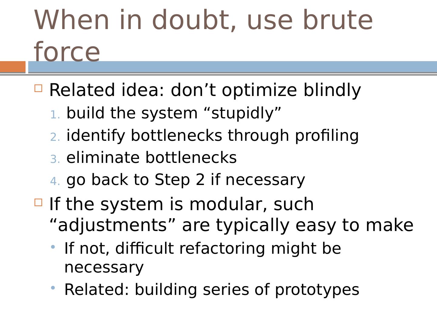27 .Make it Fast Leave it to the Client Don’t Hide Power Keep Secrets Design basic interfaces that admit implementations that are fast Consider monolithic O.S. vs. microkernels Clients can implement the rest Abstraction should hide only undesirable properties What are examples of undesirable? Non-portable Don’t tell clients about implementation details they can exploit Leads to non-portability, applications breaking when modules are updated, etc. Bad example: TCP