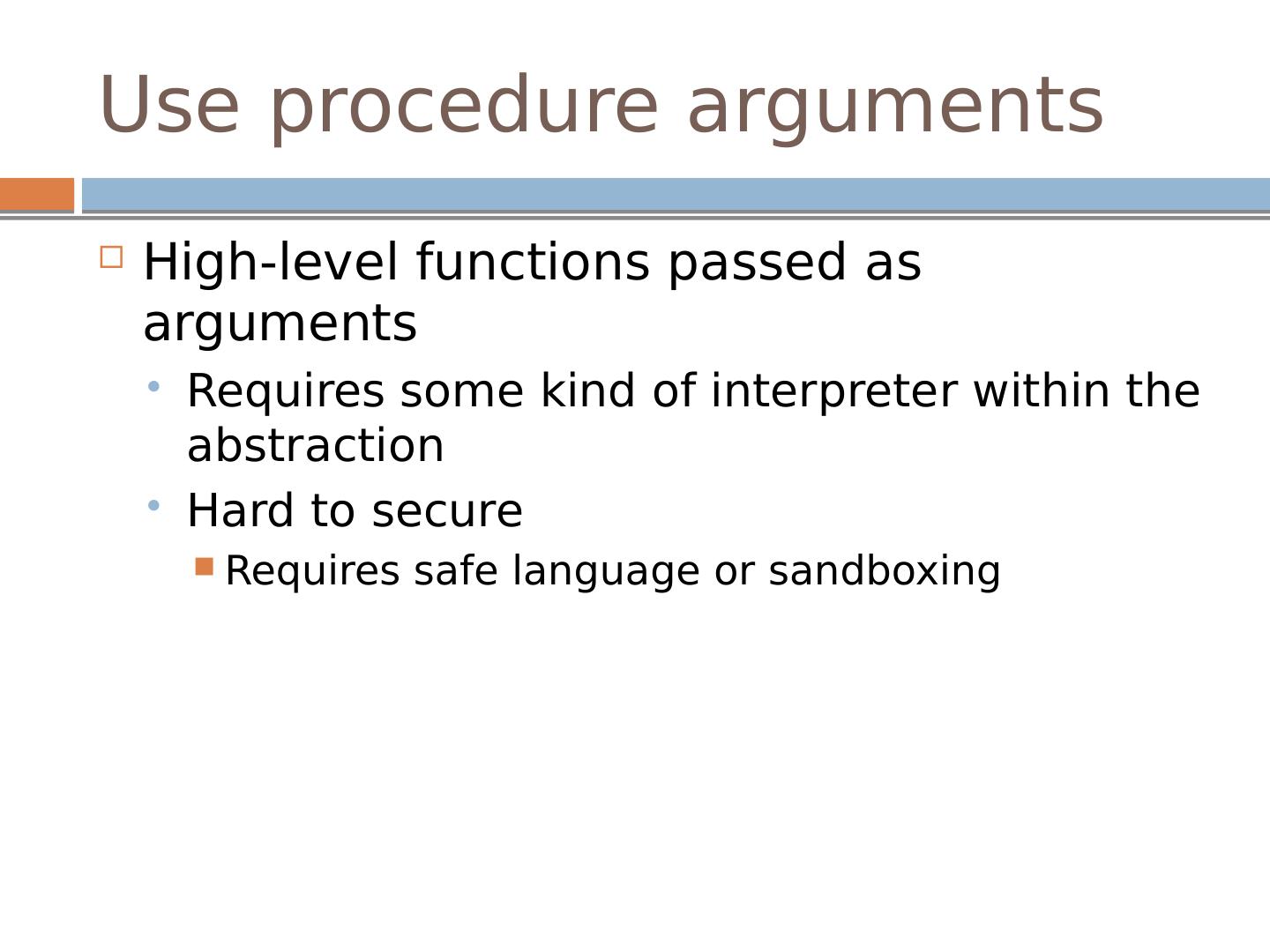 28 .Use procedure arguments High-level functions passed as arguments Requires some kind of interpreter within the abstraction Hard to secure Requires safe language or sandboxing