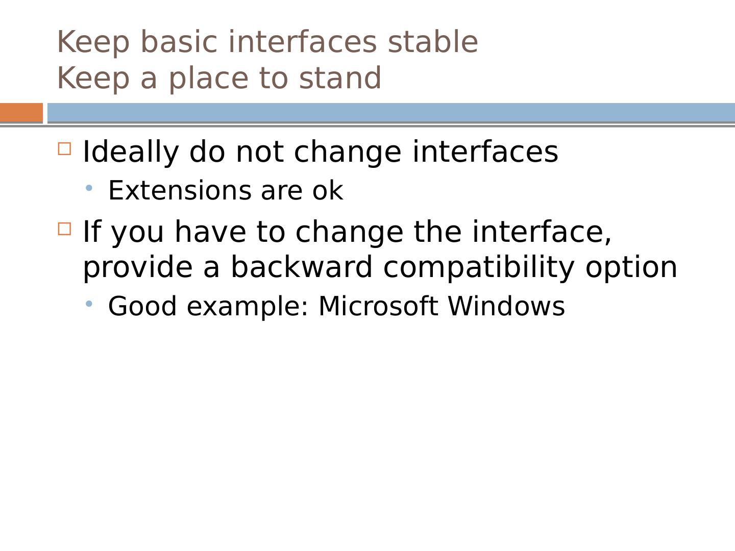 29 .Keep basic interfaces stable Keep a place to stand Ideally do not change interfaces Extensions are ok If you have to change the interface, provide a backward compatibility option Good example: Microsoft Windows