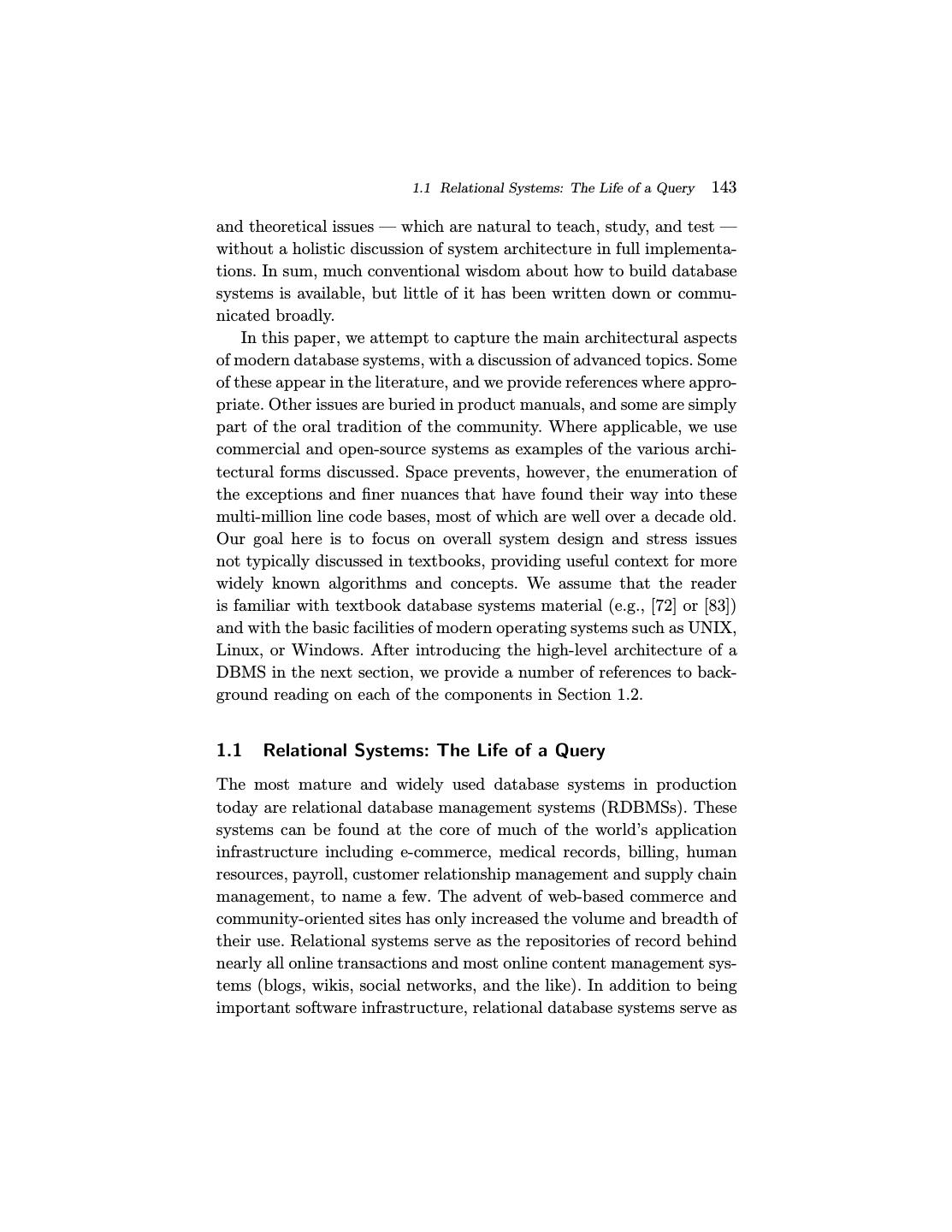3 . 1.1 Relational Systems: The Life of a Query 143 and theoretical issues — which are natural to teach, study, and test — without a holistic discussion of system architecture in full implementa- tions. In sum, much conventional wisdom about how to build database systems is available, but little of it has been written down or commu- nicated broadly. In this paper, we attempt to capture the main architectural aspects of modern database systems, with a discussion of advanced topics. Some of these appear in the literature, and we provide references where appro- priate. Other issues are buried in product manuals, and some are simply part of the oral tradition of the community. Where applicable, we use commercial and open-source systems as examples of the various archi- tectural forms discussed. Space prevents, however, the enumeration of the exceptions and finer nuances that have found their way into these multi-million line code bases, most of which are well over a decade old. Our goal here is to focus on overall system design and stress issues not typically discussed in textbooks, providing useful context for more widely known algorithms and concepts. We assume that the reader is familiar with textbook database systems material (e.g., [72] or [83]) and with the basic facilities of modern operating systems such as UNIX, Linux, or Windows. After introducing the high-level architecture of a DBMS in the next section, we provide a number of references to back- ground reading on each of the components in Section 1.2. 1.1 Relational Systems: The Life of a Query The most mature and widely used database systems in production today are relational database management systems (RDBMSs). These systems can be found at the core of much of the world’s application infrastructure including e-commerce, medical records, billing, human resources, payroll, customer relationship management and supply chain management, to name a few. The advent of web-based commerce and community-oriented sites has only increased the volume and breadth of their use. Relational systems serve as the repositories of record behind nearly all online transactions and most online content management sys- tems (blogs, wikis, social networks, and the like). In addition to being important software infrastructure, relational database systems serve as
