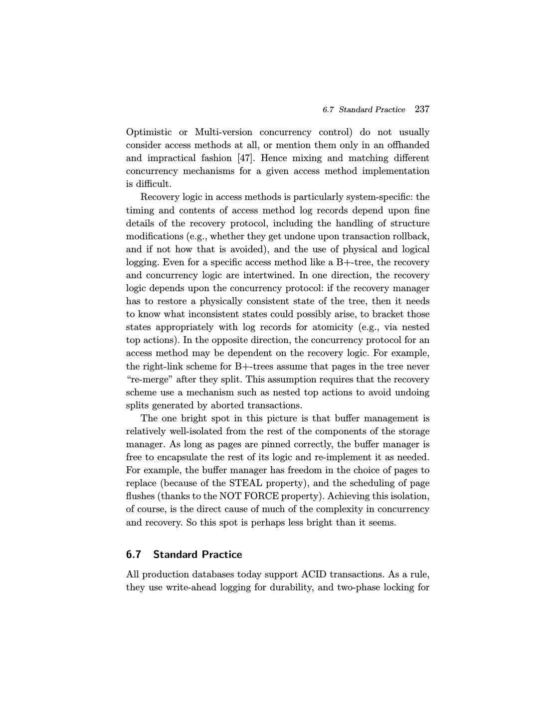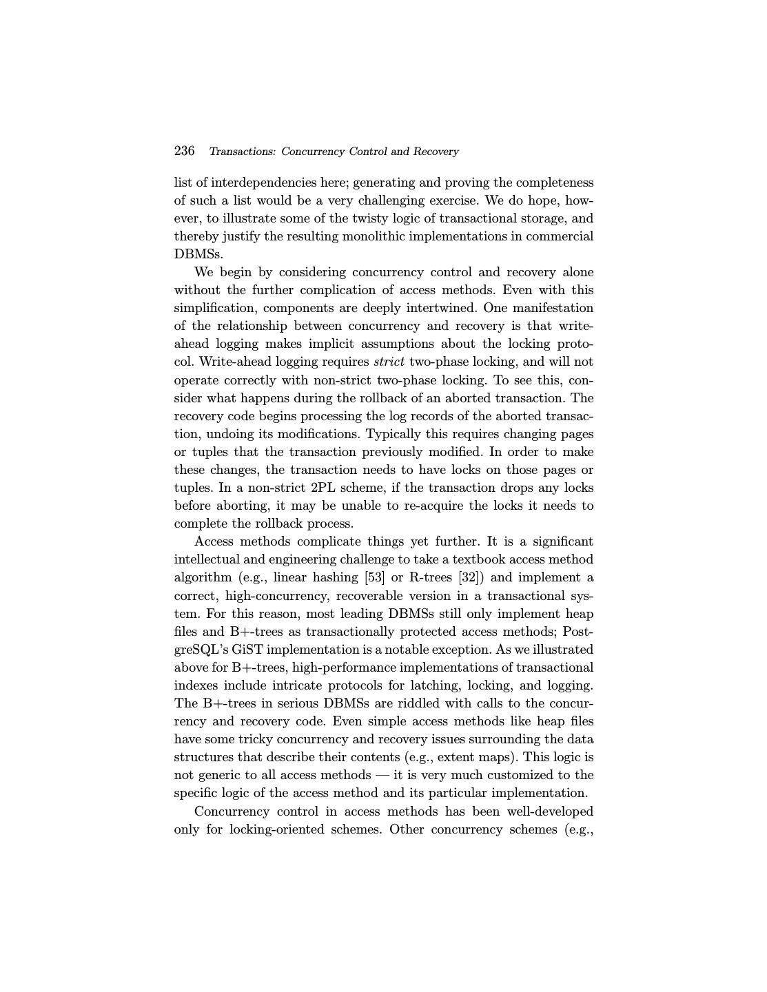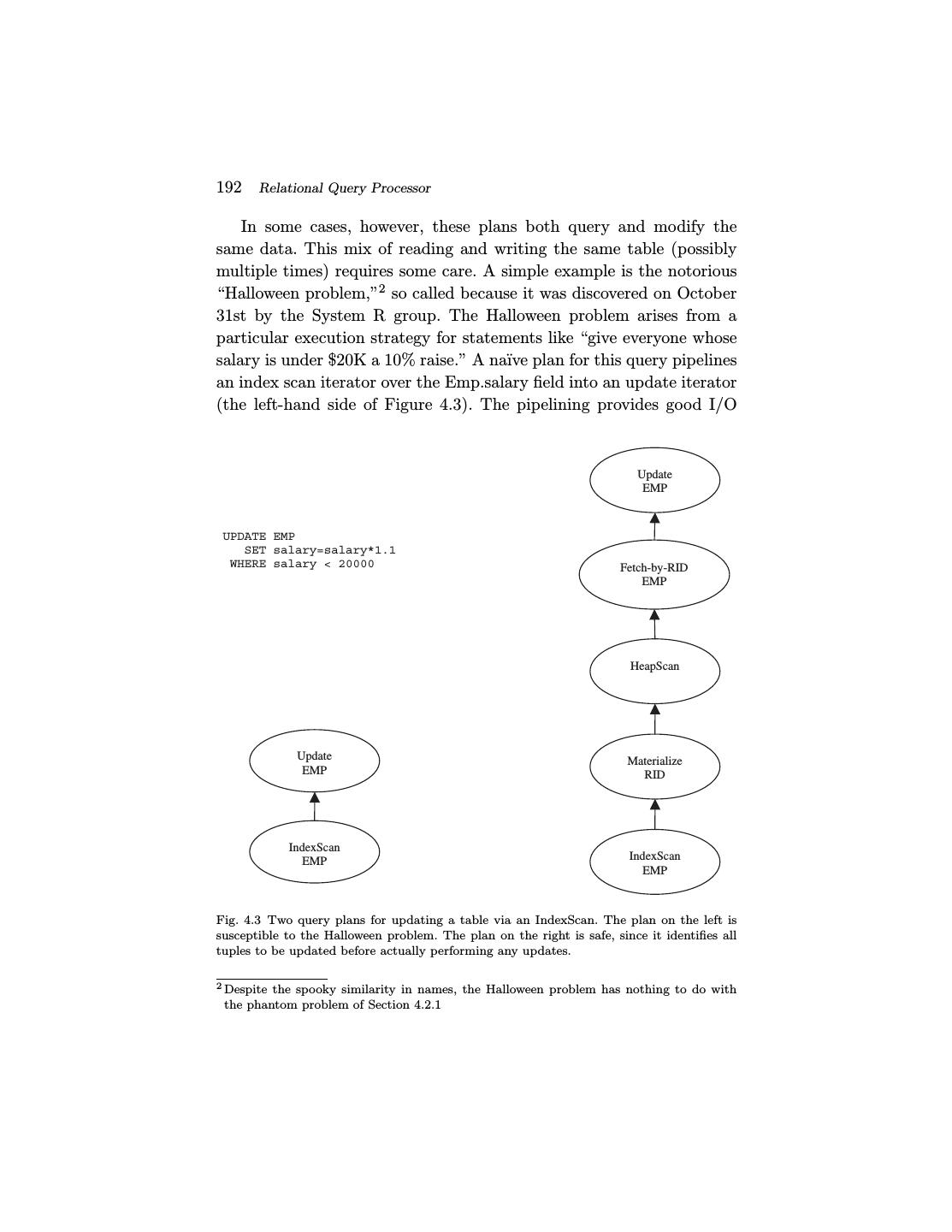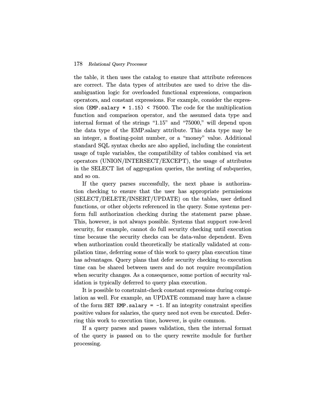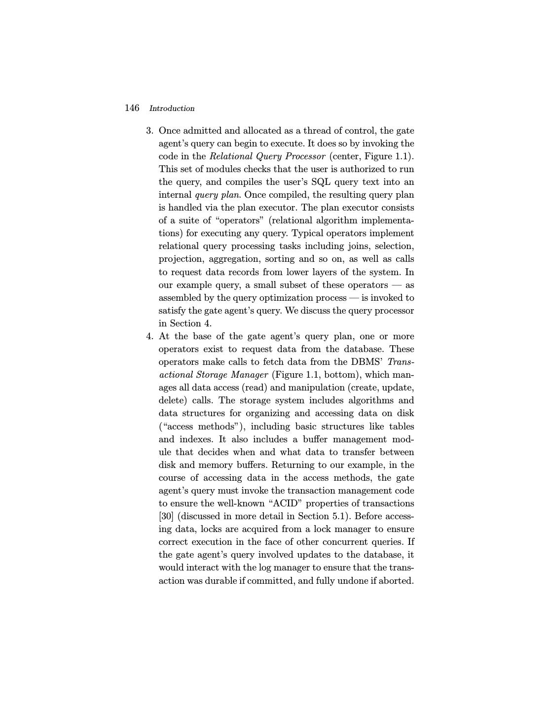 6 .146 Introduction 3. Once admitted and allocated as a thread of control, the gate agent’s query can begin to execute. It does so by invoking the code in the Relational Query Processor (center, Figure 1.1). This set of modules checks that the user is authorized to run the query, and compiles the user’s SQL query text into an internal query plan. Once compiled, the resulting query plan is handled via the plan executor. The plan executor consists of a suite of “operators” (relational algorithm implementa- tions) for executing any query. Typical operators implement relational query processing tasks including joins, selection, projection, aggregation, sorting and so on, as well as calls to request data records from lower layers of the system. In our example query, a small subset of these operators — as assembled by the query optimization process — is invoked to satisfy the gate agent’s query. We discuss the query processor in Section 4. 4. At the base of the gate agent’s query plan, one or more operators exist to request data from the database. These operators make calls to fetch data from the DBMS’ Trans- actional Storage Manager (Figure 1.1, bottom), which man- ages all data access (read) and manipulation (create, update, delete) calls. The storage system includes algorithms and data structures for organizing and accessing data on disk (“access methods”), including basic structures like tables and indexes. It also includes a buffer management mod- ule that decides when and what data to transfer between disk and memory buffers. Returning to our example, in the course of accessing data in the access methods, the gate agent’s query must invoke the transaction management code to ensure the well-known “ACID” properties of transactions [30] (discussed in more detail in Section 5.1). Before access- ing data, locks are acquired from a lock manager to ensure correct execution in the face of other concurrent queries. If the gate agent’s query involved updates to the database, it would interact with the log manager to ensure that the trans- action was durable if committed, and fully undone if aborted.
