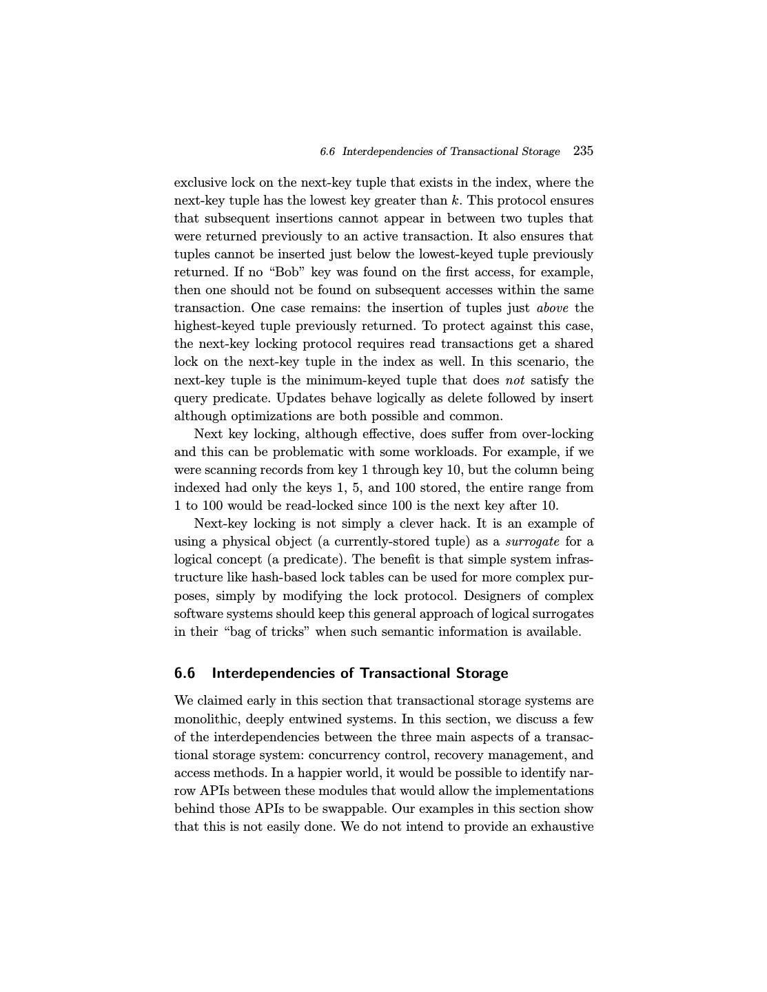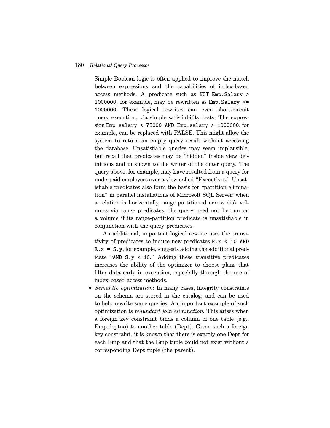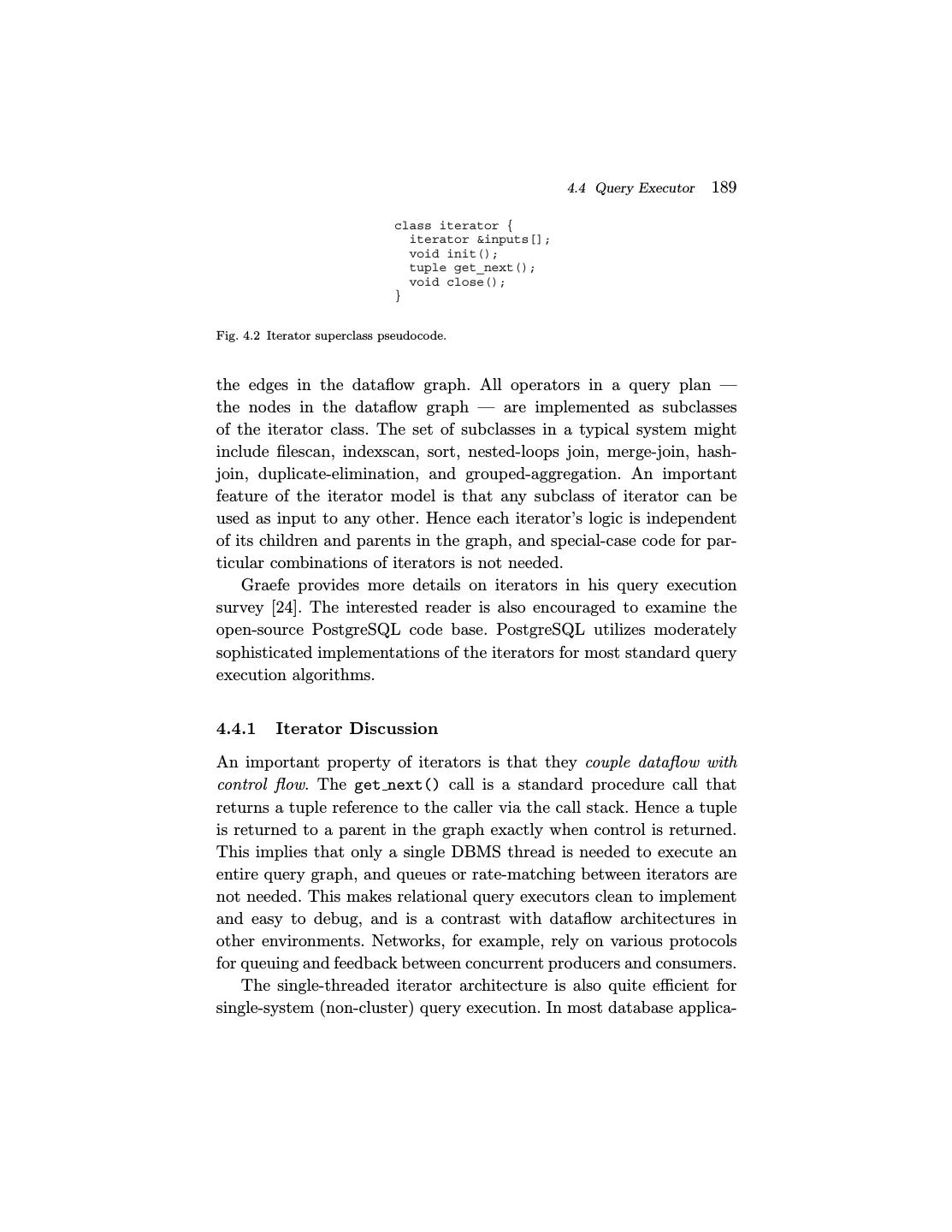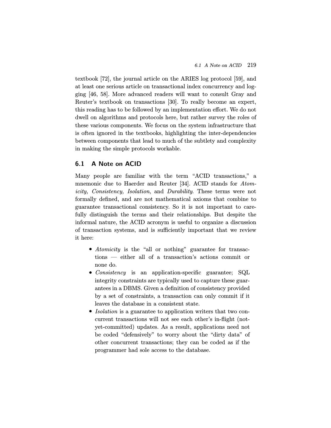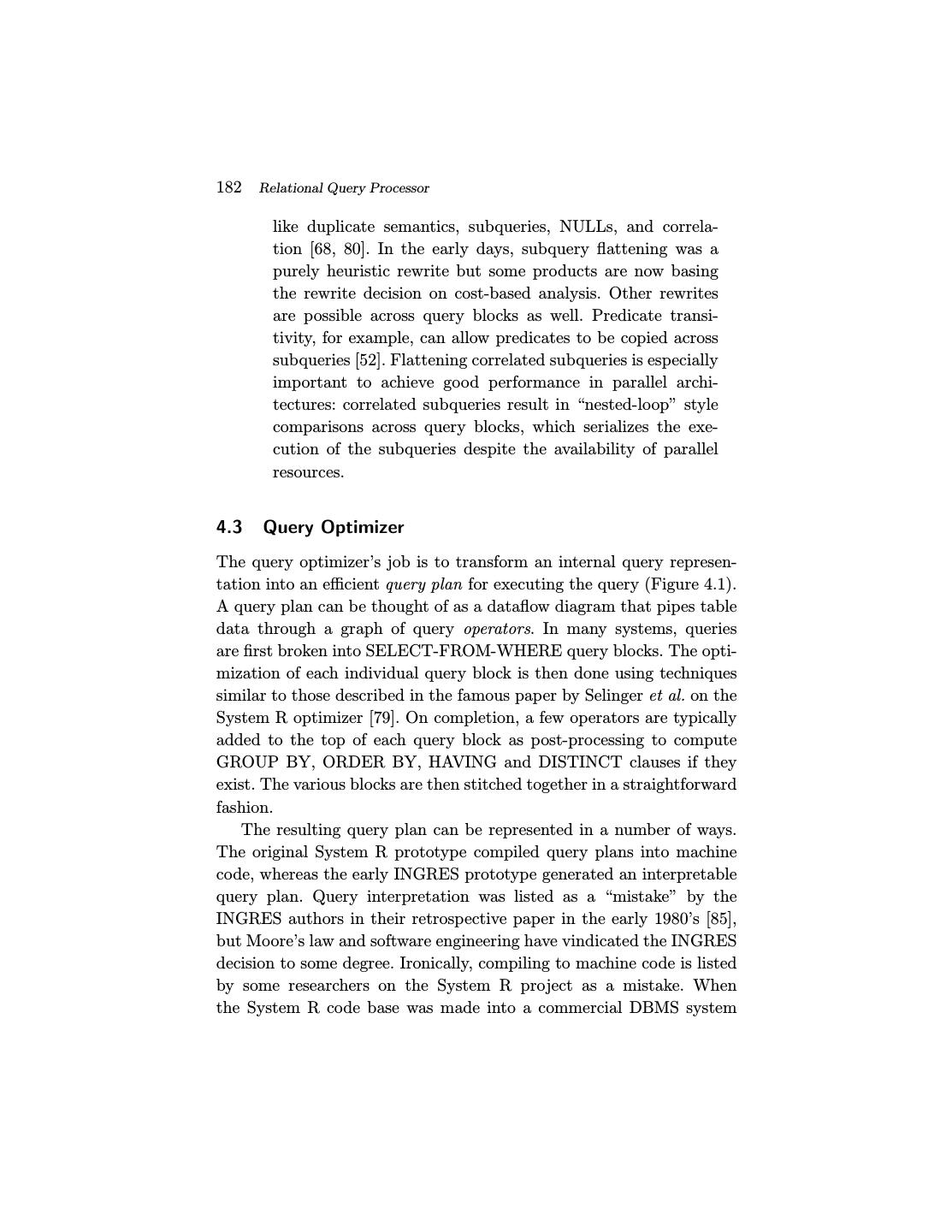 6 .146 Introduction 3. Once admitted and allocated as a thread of control, the gate agent’s query can begin to execute. It does so by invoking the code in the Relational Query Processor (center, Figure 1.1). This set of modules checks that the user is authorized to run the query, and compiles the user’s SQL query text into an internal query plan. Once compiled, the resulting query plan is handled via the plan executor. The plan executor consists of a suite of “operators” (relational algorithm implementa- tions) for executing any query. Typical operators implement relational query processing tasks including joins, selection, projection, aggregation, sorting and so on, as well as calls to request data records from lower layers of the system. In our example query, a small subset of these operators — as assembled by the query optimization process — is invoked to satisfy the gate agent’s query. We discuss the query processor in Section 4. 4. At the base of the gate agent’s query plan, one or more operators exist to request data from the database. These operators make calls to fetch data from the DBMS’ Trans- actional Storage Manager (Figure 1.1, bottom), which man- ages all data access (read) and manipulation (create, update, delete) calls. The storage system includes algorithms and data structures for organizing and accessing data on disk (“access methods”), including basic structures like tables and indexes. It also includes a buffer management mod- ule that decides when and what data to transfer between disk and memory buffers. Returning to our example, in the course of accessing data in the access methods, the gate agent’s query must invoke the transaction management code to ensure the well-known “ACID” properties of transactions [30] (discussed in more detail in Section 5.1). Before access- ing data, locks are acquired from a lock manager to ensure correct execution in the face of other concurrent queries. If the gate agent’s query involved updates to the database, it would interact with the log manager to ensure that the trans- action was durable if committed, and fully undone if aborted.