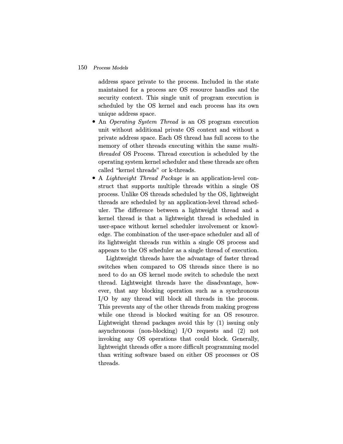 10 .150 Process Models address space private to the process. Included in the state maintained for a process are OS resource handles and the security context. This single unit of program execution is scheduled by the OS kernel and each process has its own unique address space. • An Operating System Thread is an OS program execution unit without additional private OS context and without a private address space. Each OS thread has full access to the memory of other threads executing within the same multi- threaded OS Process. Thread execution is scheduled by the operating system kernel scheduler and these threads are often called “kernel threads” or k-threads. • A Lightweight Thread Package is an application-level con- struct that supports multiple threads within a single OS process. Unlike OS threads scheduled by the OS, lightweight threads are scheduled by an application-level thread sched- uler. The difference between a lightweight thread and a kernel thread is that a lightweight thread is scheduled in user-space without kernel scheduler involvement or knowl- edge. The combination of the user-space scheduler and all of its lightweight threads run within a single OS process and appears to the OS scheduler as a single thread of execution. Lightweight threads have the advantage of faster thread switches when compared to OS threads since there is no need to do an OS kernel mode switch to schedule the next thread. Lightweight threads have the disadvantage, how- ever, that any blocking operation such as a synchronous I/O by any thread will block all threads in the process. This prevents any of the other threads from making progress while one thread is blocked waiting for an OS resource. Lightweight thread packages avoid this by (1) issuing only asynchronous (non-blocking) I/O requests and (2) not invoking any OS operations that could block. Generally, lightweight threads offer a more difficult programming model than writing software based on either OS processes or OS threads.
