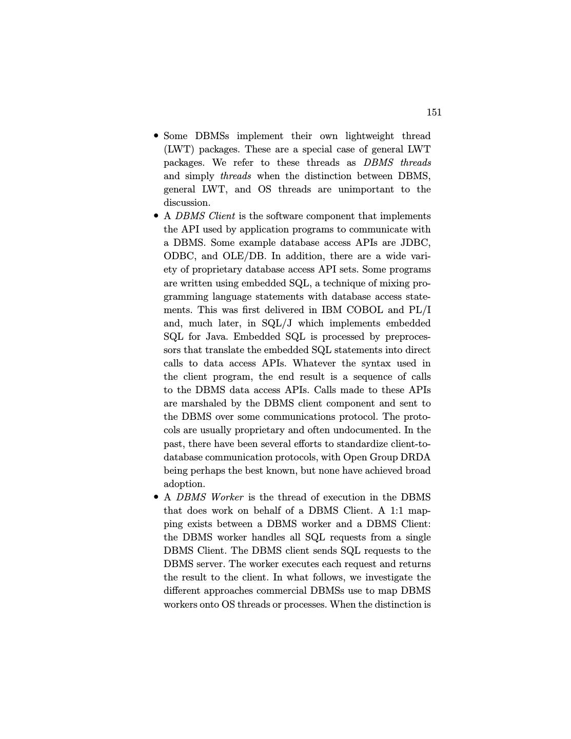 11 . 151 • Some DBMSs implement their own lightweight thread (LWT) packages. These are a special case of general LWT packages. We refer to these threads as DBMS threads and simply threads when the distinction between DBMS, general LWT, and OS threads are unimportant to the discussion. • A DBMS Client is the software component that implements the API used by application programs to communicate with a DBMS. Some example database access APIs are JDBC, ODBC, and OLE/DB. In addition, there are a wide vari- ety of proprietary database access API sets. Some programs are written using embedded SQL, a technique of mixing pro- gramming language statements with database access state- ments. This was first delivered in IBM COBOL and PL/I and, much later, in SQL/J which implements embedded SQL for Java. Embedded SQL is processed by preproces- sors that translate the embedded SQL statements into direct calls to data access APIs. Whatever the syntax used in the client program, the end result is a sequence of calls to the DBMS data access APIs. Calls made to these APIs are marshaled by the DBMS client component and sent to the DBMS over some communications protocol. The proto- cols are usually proprietary and often undocumented. In the past, there have been several efforts to standardize client-to- database communication protocols, with Open Group DRDA being perhaps the best known, but none have achieved broad adoption. • A DBMS Worker is the thread of execution in the DBMS that does work on behalf of a DBMS Client. A 1:1 map- ping exists between a DBMS worker and a DBMS Client: the DBMS worker handles all SQL requests from a single DBMS Client. The DBMS client sends SQL requests to the DBMS server. The worker executes each request and returns the result to the client. In what follows, we investigate the different approaches commercial DBMSs use to map DBMS workers onto OS threads or processes. When the distinction is
