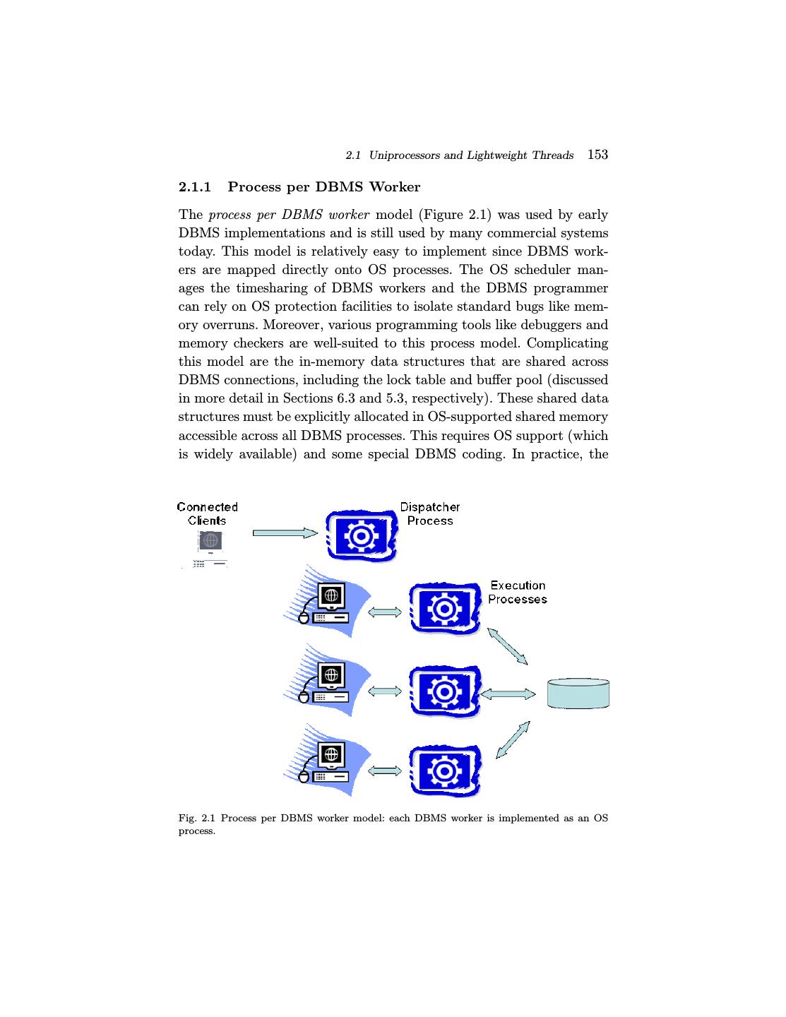 14 .154 Process Models required extensive use of shared memory in this model reduces some of the advantages of address space separation, given that a good fraction of “interesting” memory is shared across processes. In terms of scaling to very large numbers of concurrent connections, process per DBMS worker is not the most attractive process model. The scaling issues arise because a process has more state than a thread and consequently consumes more memory. A process switch requires switch- ing security context, memory manager state, file and network handle tables, and other process context. This is not needed with a thread switch. Nonetheless, the process per DBMS worker model remains pop- ular and is supported by IBM DB2, PostgreSQL, and Oracle. 2.1.2 Thread per DBMS Worker In the thread per DBMS worker model (Figure 2.2), a single multi- threaded process hosts all the DBMS worker activity. A dispatcher Fig. 2.2 Thread per DBMS worker model: each DBMS worker is implemented as an OS thread.