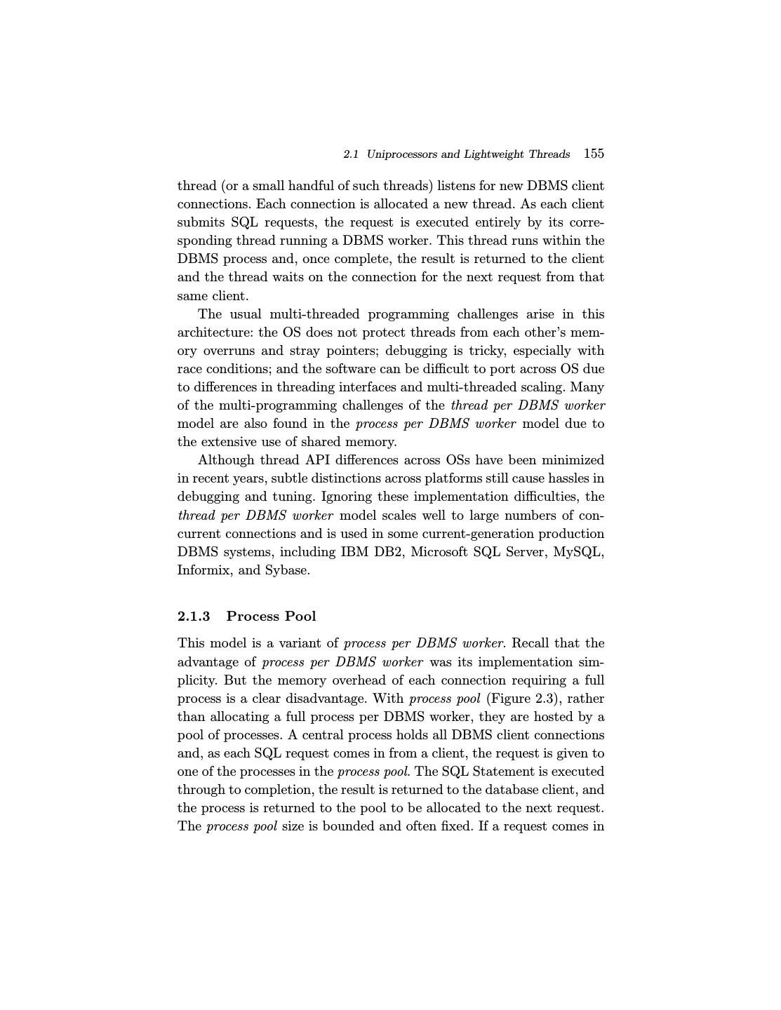 15 . 2.1 Uniprocessors and Lightweight Threads 155 thread (or a small handful of such threads) listens for new DBMS client connections. Each connection is allocated a new thread. As each client submits SQL requests, the request is executed entirely by its corre- sponding thread running a DBMS worker. This thread runs within the DBMS process and, once complete, the result is returned to the client and the thread waits on the connection for the next request from that same client. The usual multi-threaded programming challenges arise in this architecture: the OS does not protect threads from each other’s mem- ory overruns and stray pointers; debugging is tricky, especially with race conditions; and the software can be difficult to port across OS due to differences in threading interfaces and multi-threaded scaling. Many of the multi-programming challenges of the thread per DBMS worker model are also found in the process per DBMS worker model due to the extensive use of shared memory. Although thread API differences across OSs have been minimized in recent years, subtle distinctions across platforms still cause hassles in debugging and tuning. Ignoring these implementation difficulties, the thread per DBMS worker model scales well to large numbers of con- current connections and is used in some current-generation production DBMS systems, including IBM DB2, Microsoft SQL Server, MySQL, Informix, and Sybase. 2.1.3 Process Pool This model is a variant of process per DBMS worker. Recall that the advantage of process per DBMS worker was its implementation sim- plicity. But the memory overhead of each connection requiring a full process is a clear disadvantage. With process pool (Figure 2.3), rather than allocating a full process per DBMS worker, they are hosted by a pool of processes. A central process holds all DBMS client connections and, as each SQL request comes in from a client, the request is given to one of the processes in the process pool. The SQL Statement is executed through to completion, the result is returned to the database client, and the process is returned to the pool to be allocated to the next request. The process pool size is bounded and often fixed. If a request comes in