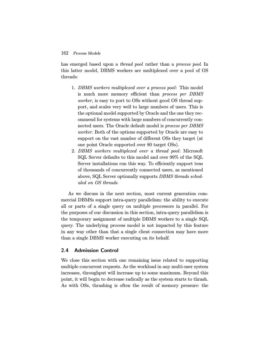 22 .162 Process Models has emerged based upon a thread pool rather than a process pool. In this latter model, DBMS workers are multiplexed over a pool of OS threads: 1. DBMS workers multiplexed over a process pool : This model is much more memory efficient than process per DBMS worker, is easy to port to OSs without good OS thread sup- port, and scales very well to large numbers of users. This is the optional model supported by Oracle and the one they rec- ommend for systems with large numbers of concurrently con- nected users. The Oracle default model is process per DBMS worker. Both of the options supported by Oracle are easy to support on the vast number of different OSs they target (at one point Oracle supported over 80 target OSs). 2. DBMS workers multiplexed over a thread pool : Microsoft SQL Server defaults to this model and over 99% of the SQL Server installations run this way. To efficiently support tens of thousands of concurrently connected users, as mentioned above, SQL Server optionally supports DBMS threads sched- uled on OS threads. As we discuss in the next section, most current generation com- mercial DBMSs support intra-query parallelism: the ability to execute all or parts of a single query on multiple processors in parallel. For the purposes of our discussion in this section, intra-query parallelism is the temporary assignment of multiple DBMS workers to a single SQL query. The underlying process model is not impacted by this feature in any way other than that a single client connection may have more than a single DBMS worker executing on its behalf. 2.4 Admission Control We close this section with one remaining issue related to supporting multiple concurrent requests. As the workload in any multi-user system increases, throughput will increase up to some maximum. Beyond this point, it will begin to decrease radically as the system starts to thrash. As with OSs, thrashing is often the result of memory pressure: the