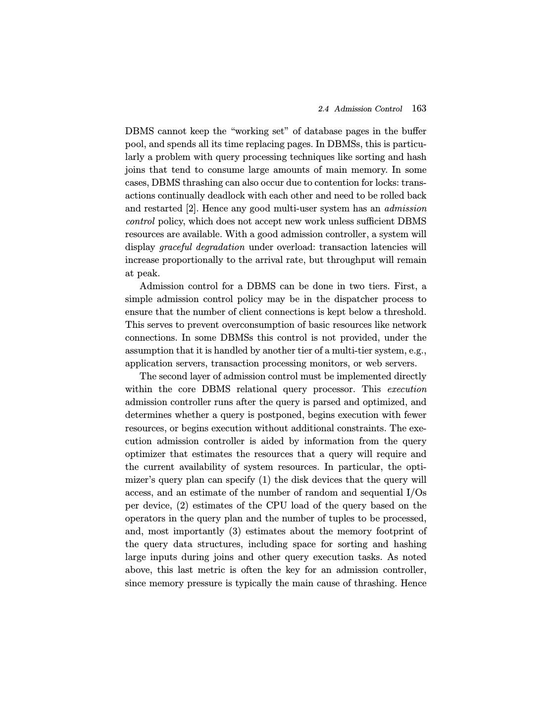 23 . 2.4 Admission Control 163 DBMS cannot keep the “working set” of database pages in the buffer pool, and spends all its time replacing pages. In DBMSs, this is particu- larly a problem with query processing techniques like sorting and hash joins that tend to consume large amounts of main memory. In some cases, DBMS thrashing can also occur due to contention for locks: trans- actions continually deadlock with each other and need to be rolled back and restarted [2]. Hence any good multi-user system has an admission control policy, which does not accept new work unless sufficient DBMS resources are available. With a good admission controller, a system will display graceful degradation under overload: transaction latencies will increase proportionally to the arrival rate, but throughput will remain at peak. Admission control for a DBMS can be done in two tiers. First, a simple admission control policy may be in the dispatcher process to ensure that the number of client connections is kept below a threshold. This serves to prevent overconsumption of basic resources like network connections. In some DBMSs this control is not provided, under the assumption that it is handled by another tier of a multi-tier system, e.g., application servers, transaction processing monitors, or web servers. The second layer of admission control must be implemented directly within the core DBMS relational query processor. This execution admission controller runs after the query is parsed and optimized, and determines whether a query is postponed, begins execution with fewer resources, or begins execution without additional constraints. The exe- cution admission controller is aided by information from the query optimizer that estimates the resources that a query will require and the current availability of system resources. In particular, the opti- mizer’s query plan can specify (1) the disk devices that the query will access, and an estimate of the number of random and sequential I/Os per device, (2) estimates of the CPU load of the query based on the operators in the query plan and the number of tuples to be processed, and, most importantly (3) estimates about the memory footprint of the query data structures, including space for sorting and hashing large inputs during joins and other query execution tasks. As noted above, this last metric is often the key for an admission controller, since memory pressure is typically the main cause of thrashing. Hence