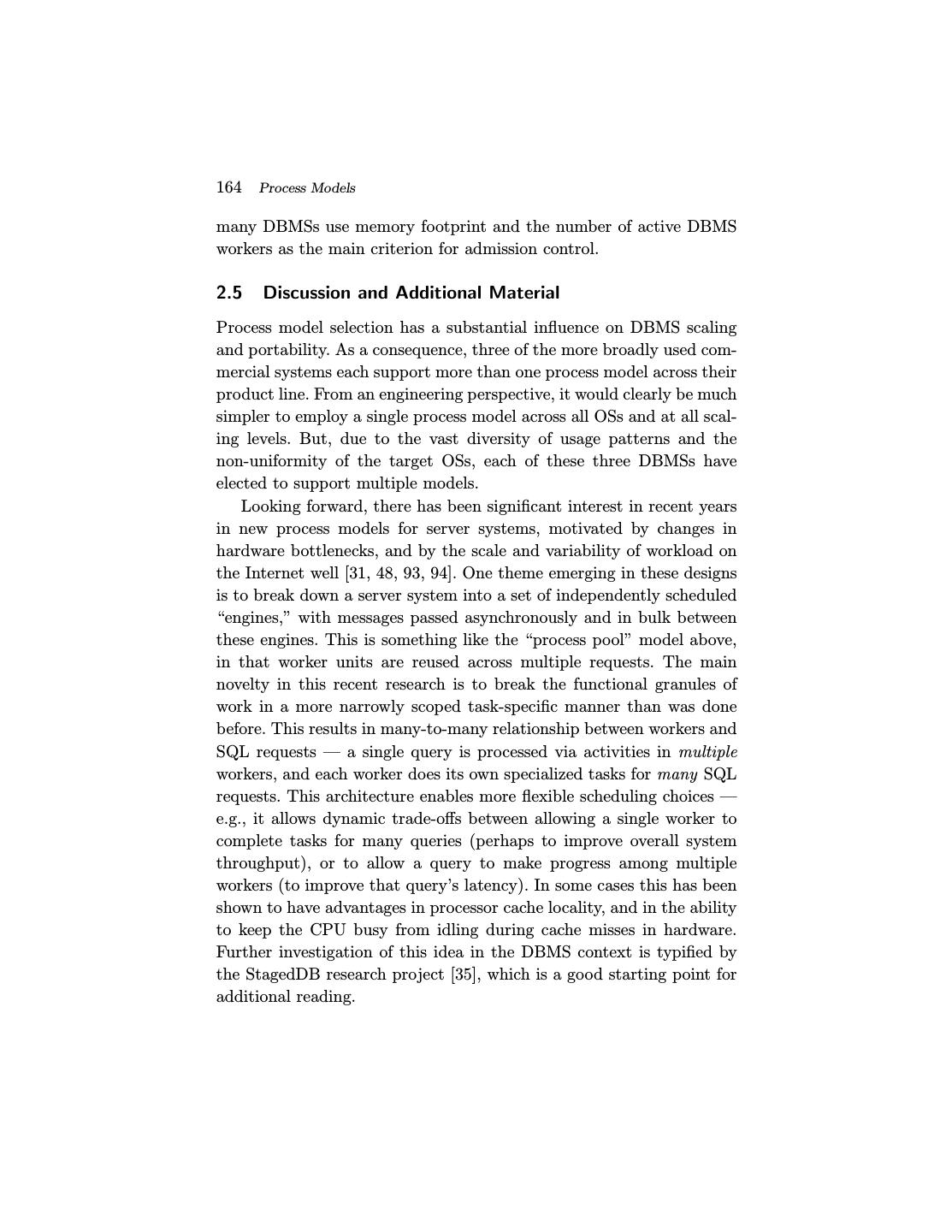 24 .164 Process Models many DBMSs use memory footprint and the number of active DBMS workers as the main criterion for admission control. 2.5 Discussion and Additional Material Process model selection has a substantial influence on DBMS scaling and portability. As a consequence, three of the more broadly used com- mercial systems each support more than one process model across their product line. From an engineering perspective, it would clearly be much simpler to employ a single process model across all OSs and at all scal- ing levels. But, due to the vast diversity of usage patterns and the non-uniformity of the target OSs, each of these three DBMSs have elected to support multiple models. Looking forward, there has been significant interest in recent years in new process models for server systems, motivated by changes in hardware bottlenecks, and by the scale and variability of workload on the Internet well [31, 48, 93, 94]. One theme emerging in these designs is to break down a server system into a set of independently scheduled “engines,” with messages passed asynchronously and in bulk between these engines. This is something like the “process pool” model above, in that worker units are reused across multiple requests. The main novelty in this recent research is to break the functional granules of work in a more narrowly scoped task-specific manner than was done before. This results in many-to-many relationship between workers and SQL requests — a single query is processed via activities in multiple workers, and each worker does its own specialized tasks for many SQL requests. This architecture enables more flexible scheduling choices — e.g., it allows dynamic trade-offs between allowing a single worker to complete tasks for many queries (perhaps to improve overall system throughput), or to allow a query to make progress among multiple workers (to improve that query’s latency). In some cases this has been shown to have advantages in processor cache locality, and in the ability to keep the CPU busy from idling during cache misses in hardware. Further investigation of this idea in the DBMS context is typified by the StagedDB research project [35], which is a good starting point for additional reading.
