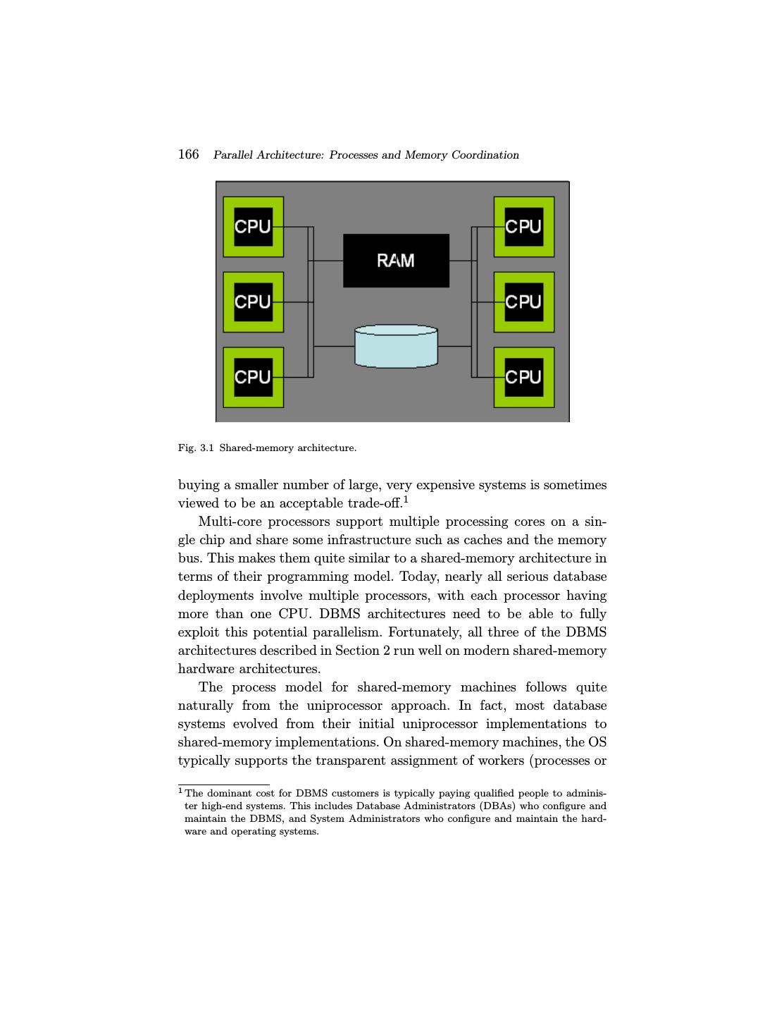 25 . 3 Parallel Architecture: Processes and Memory Coordination Parallel hardware is a fact of life in modern servers and comes in a variety of configurations. In this section, we summarize the standard DBMS terminology (introduced in [87]), and discuss the process models and memory coordination issues in each. 3.1 Shared Memory A shared-memory parallel system (Figure 3.1) is one in which all pro- cessors can access the same RAM and disk with roughly the same performance. This architecture is fairly standard today — most server hardware ships with between two and eight processors. High-end machines can ship with dozens of processors, but tend to be sold at a large premium relative to the processing resources provided. Highly parallel shared-memory machines are one of the last remaining “cash cows” in the hardware industry, and are used heavily in high-end online transaction processing applications. The cost of server hardware is usu- ally dwarfed by costs of administering the systems, so the expense of 165