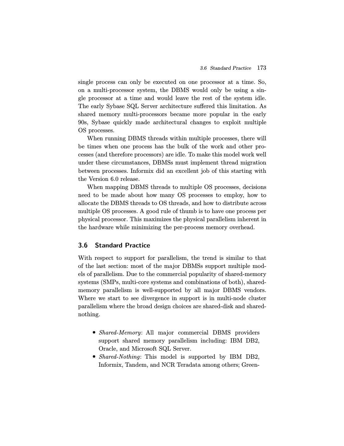 21 . 2.3 Standard Practice 161 Thread per DBMS worker : This is an efficient model with two major variants in use today: 1. OS thread per DBMS worker : IBM DB2 defaults to this model when running on systems with good OS thread sup- port and this is the model used by MySQL. 2. DBMS thread per DBMS worker : In this model, DBMS workers are scheduled by a lightweight thread scheduler on either OS processes or OS threads. This model avoids any potential OS scheduler scaling or performance problems at the expense of high implementation costs, poor development tools support, and substantial long-standing software main- tenance costs for the DBMS vendor. There are two main sub-categories of this model: a. DBMS threads scheduled on OS process: A lightweight thread scheduler is hosted by one or more OS processes. Sybase supports this model as does Informix. All current generation systems using this model implement a DBMS thread scheduler that schedules DBMS workers over multiple OS processes to exploit multiple processors. However, not all DBMSs using this model have implemented thread migration: the ability to reassign an existing DBMS thread to a different OS process (e.g., for load balancing). b. DBMS threads scheduled on OS threads: Microsoft SQL Server supports this model as a non-default option (default is DBMS workers multiplexed over a thread pool described below). This SQL Server option, called Fibers, is used in some high scale transaction processing benchmarks but, otherwise, is in fairly light use. Process/thread pool : In this model, DBMS workers are multiplexed over a pool of processes. As OS thread support has improved, a second variant of this model