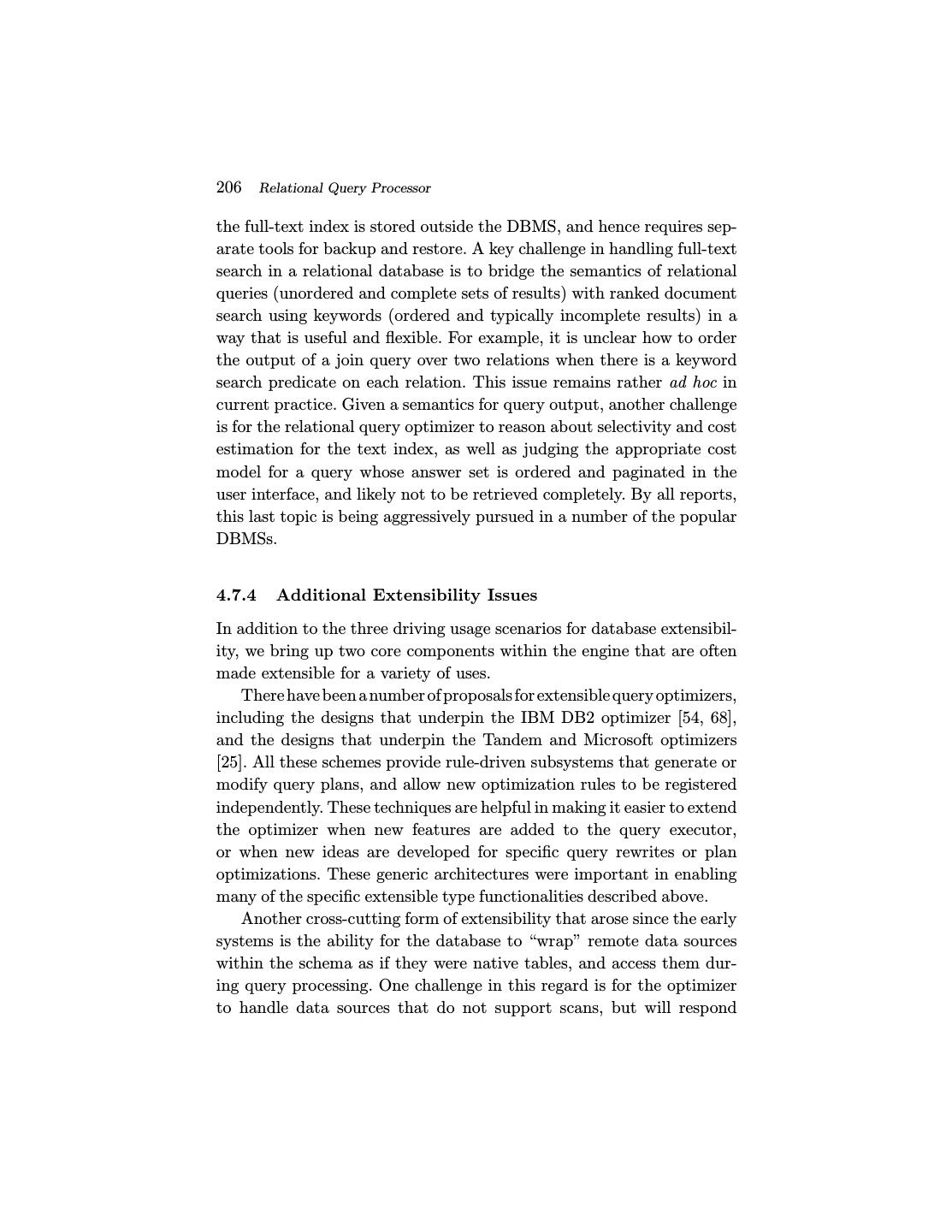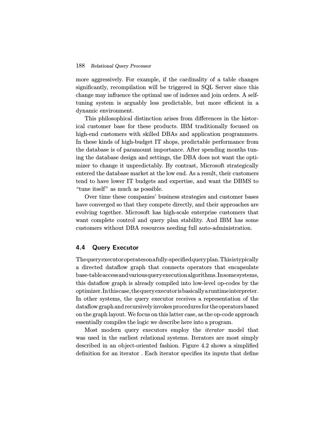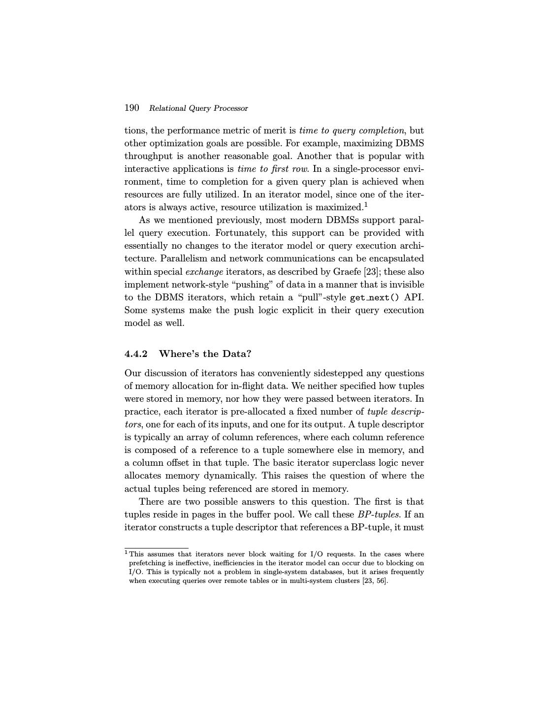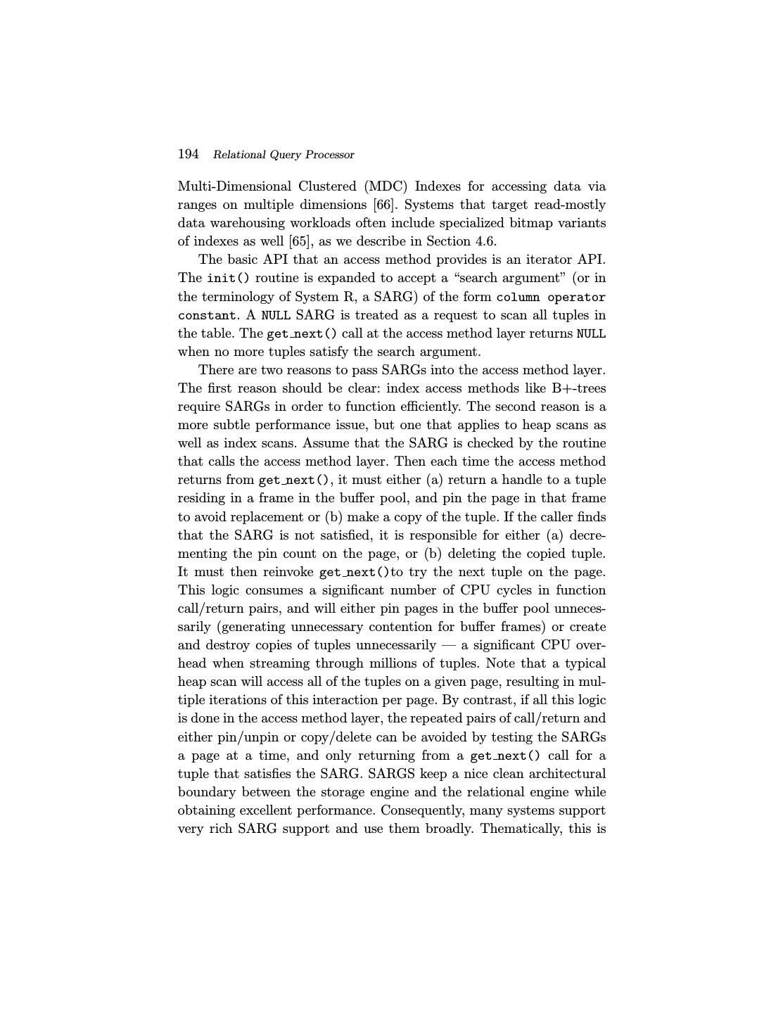 7 . 1.1 Relational Systems: The Life of a Query 147 In Section 5, we discuss storage and buffer management in more detail; Section 6 covers the transactional consistency architecture. 5. At this point in the example query’s life, it has begun to access data records, and is ready to use them to compute results for the client. This is done by “unwinding the stack” of activities we described up to this point. The access meth- ods return control to the query executor’s operators, which orchestrate the computation of result tuples from database data; as result tuples are generated, they are placed in a buffer for the client communications manager, which ships the results back to the caller. For large result sets, the client typically will make additional calls to fetch more data incrementally from the query, resulting in multiple itera- tions through the communications manager, query execu- tor, and storage manager. In our simple example, at the end of the query the transaction is completed and the connec- tion closed; this results in the transaction manager cleaning up state for the transaction, the process manager freeing any control structures for the query, and the communi- cations manager cleaning up communication state for the connection. Our discussion of this example query touches on many of the key components in an RDBMS, but not all of them. The right-hand side of Figure 1.1 depicts a number of shared components and utilities that are vital to the operation of a full-function DBMS. The catalog and memory managers are invoked as utilities during any transaction, including our example query. The catalog is used by the query proces- sor during authentication, parsing, and query optimization. The mem- ory manager is used throughout the DBMS whenever memory needs to be dynamically allocated or deallocated. The remaining modules listed in the rightmost box of Figure 1.1 are utilities that run indepen- dently of any particular query, keeping the database as a whole well- tuned and reliable. We discuss these shared components and utilities in Section 7.