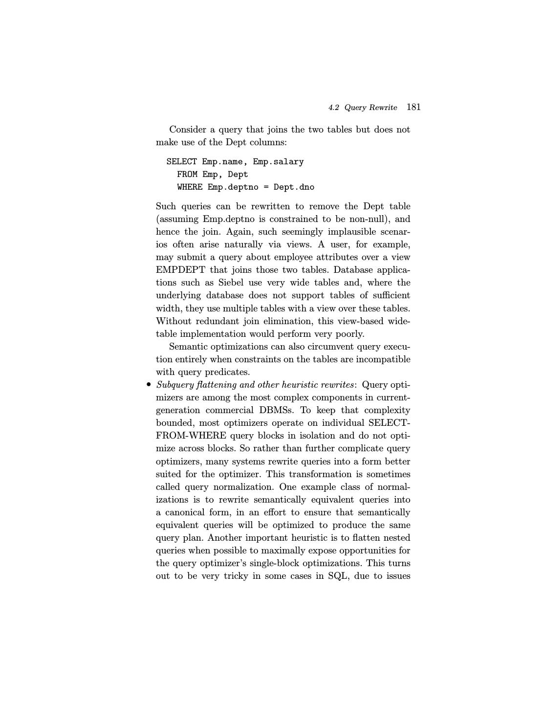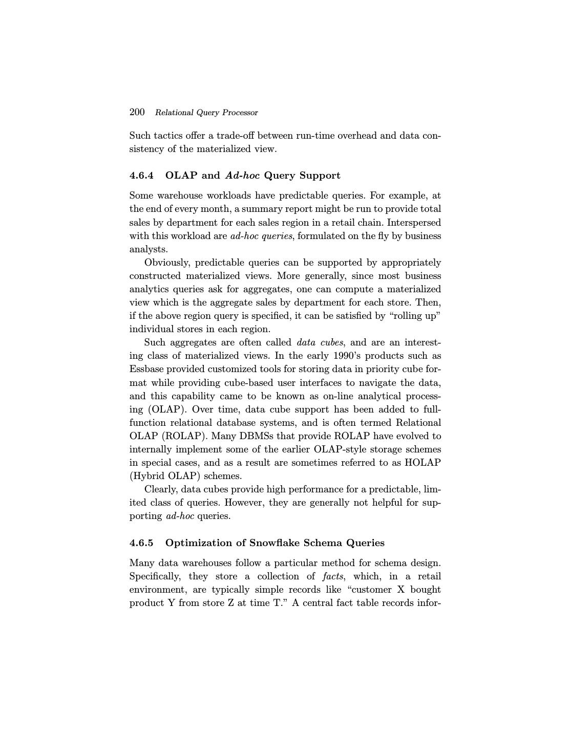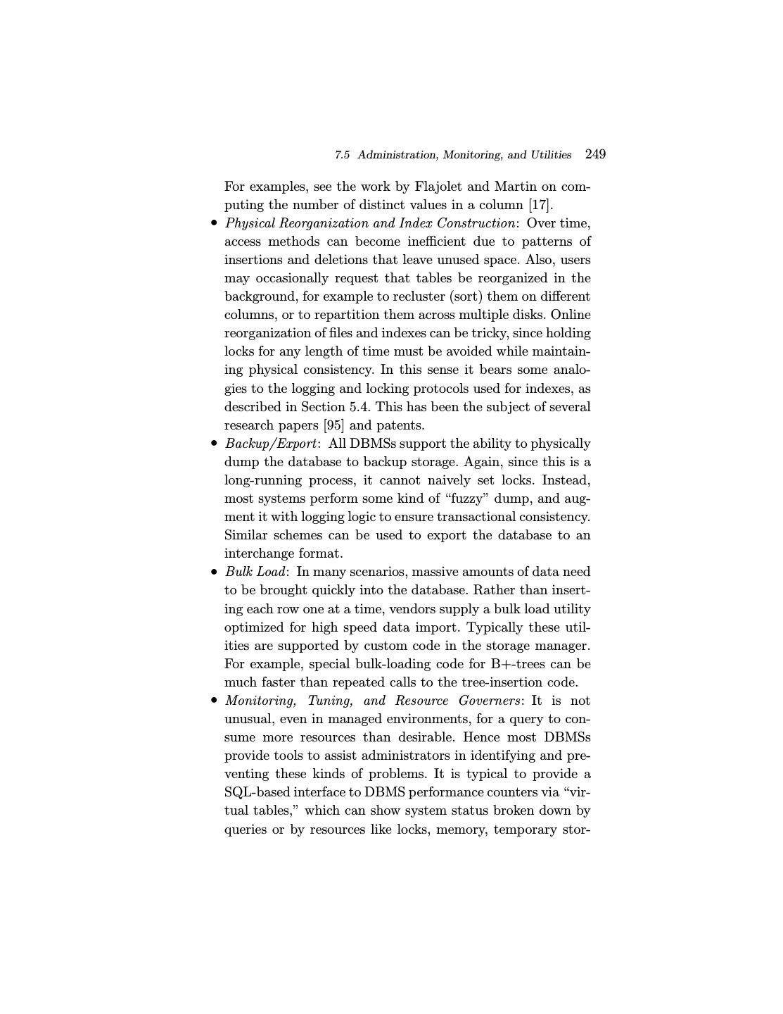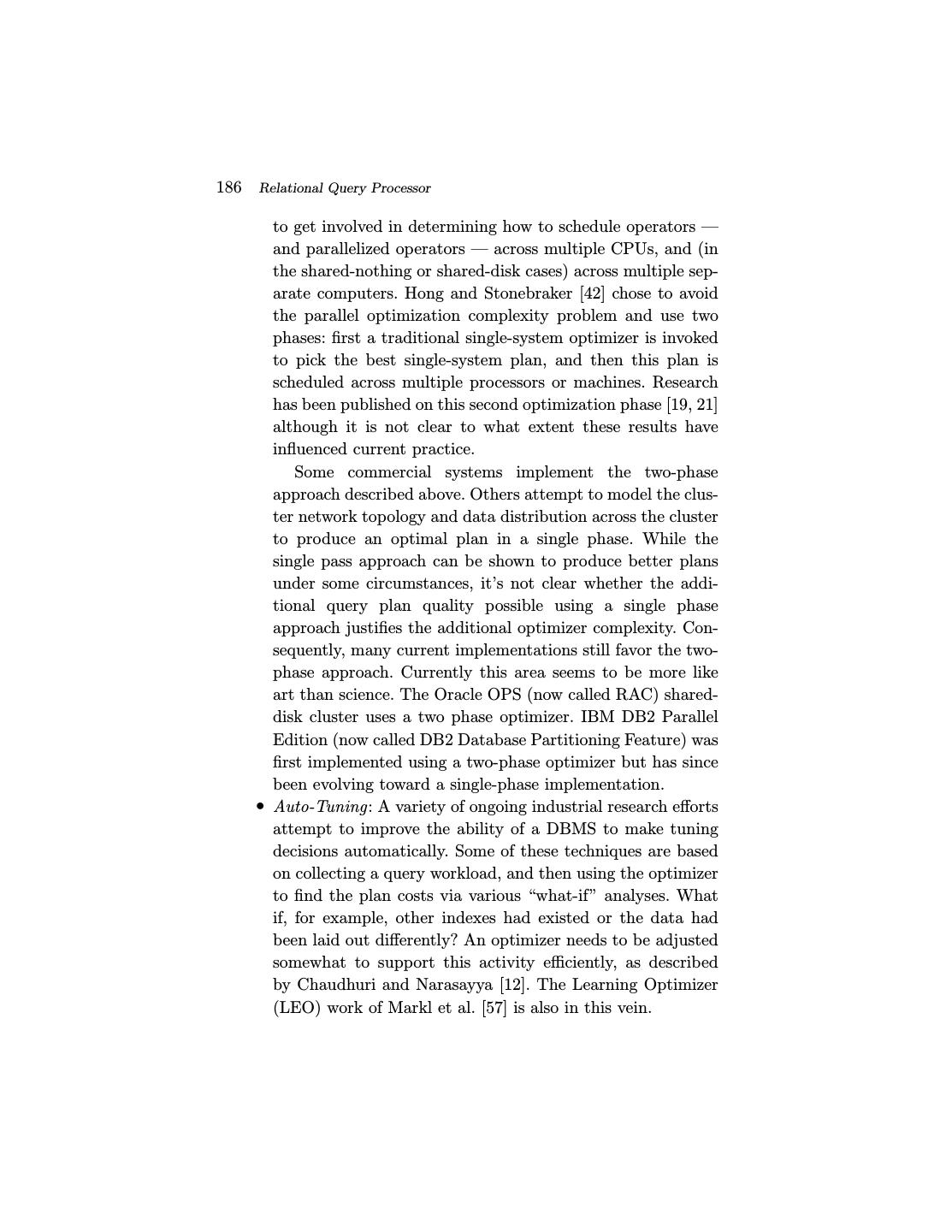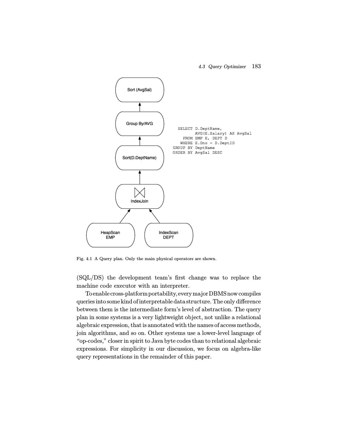7 . 1.1 Relational Systems: The Life of a Query 147 In Section 5, we discuss storage and buffer management in more detail; Section 6 covers the transactional consistency architecture. 5. At this point in the example query’s life, it has begun to access data records, and is ready to use them to compute results for the client. This is done by “unwinding the stack” of activities we described up to this point. The access meth- ods return control to the query executor’s operators, which orchestrate the computation of result tuples from database data; as result tuples are generated, they are placed in a buffer for the client communications manager, which ships the results back to the caller. For large result sets, the client typically will make additional calls to fetch more data incrementally from the query, resulting in multiple itera- tions through the communications manager, query execu- tor, and storage manager. In our simple example, at the end of the query the transaction is completed and the connec- tion closed; this results in the transaction manager cleaning up state for the transaction, the process manager freeing any control structures for the query, and the communi- cations manager cleaning up communication state for the connection. Our discussion of this example query touches on many of the key components in an RDBMS, but not all of them. The right-hand side of Figure 1.1 depicts a number of shared components and utilities that are vital to the operation of a full-function DBMS. The catalog and memory managers are invoked as utilities during any transaction, including our example query. The catalog is used by the query proces- sor during authentication, parsing, and query optimization. The mem- ory manager is used throughout the DBMS whenever memory needs to be dynamically allocated or deallocated. The remaining modules listed in the rightmost box of Figure 1.1 are utilities that run indepen- dently of any particular query, keeping the database as a whole well- tuned and reliable. We discuss these shared components and utilities in Section 7.