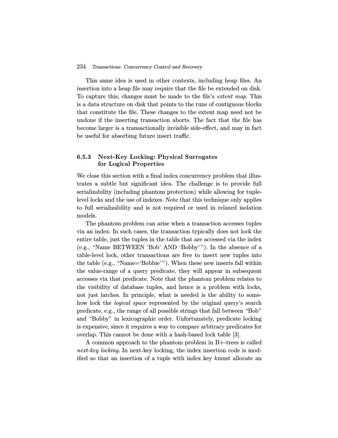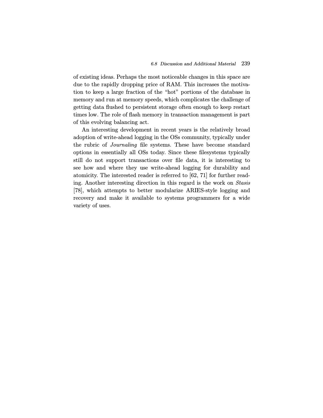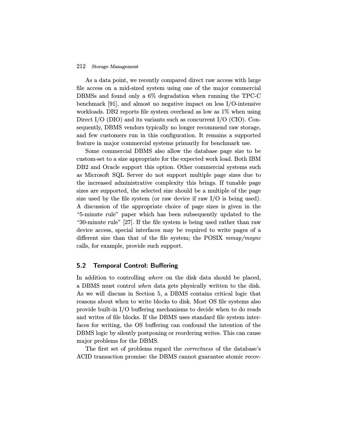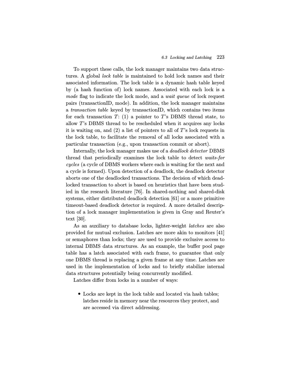 18 .158 Process Models processing, they are staged to an in-memory queue that is periodically flushed to the log disk(s) in FIFO order. This queue is usually called the log tail. In many systems, a separate process or thread is responsible for periodically flushing the log tail to the disk. With thread per DBMS worker, the log tail is simply a heap-resident data structure. In the other two models, two different design choices are common. In one approach, a separate process manages the log. Log records are com- municated to the log manager by shared memory or any other efficient inter-process communications protocol. In the other approach, the log tail is allocated in shared memory in much the same way as the buffer pool was handled above. The key point is that all threads and/or processes executing database client requests need to be able to request that log records be written and that the log tail be flushed. An important type of log flush is the commit transaction flush. A transaction cannot be reported as successfully committed until a commit log record is flushed to the log device. This means that client code waits until the commit log record is flushed, and that DBMS server code must hold all resources (e.g., locks) until that time as well. Log flush requests may be postponed for a time to allow the batching of commit records in a single I/O request (“group commit”). Client communication buffers: SQL is typically used in a “pull” model: clients consume result tuples from a query cursor by repeatedly issuing the SQL FETCH request, which retrieve one or more tuples per request. Most DBMSs try to work ahead of the stream of FETCH requests to enqueue results in advance of client requests. In order to support this prefetching behavior, the DBMS worker may use the client communications socket as a queue for the tuples it produces. More complex approaches implement client-side cursor caching and use the DBMS client to store results likely to be fetched