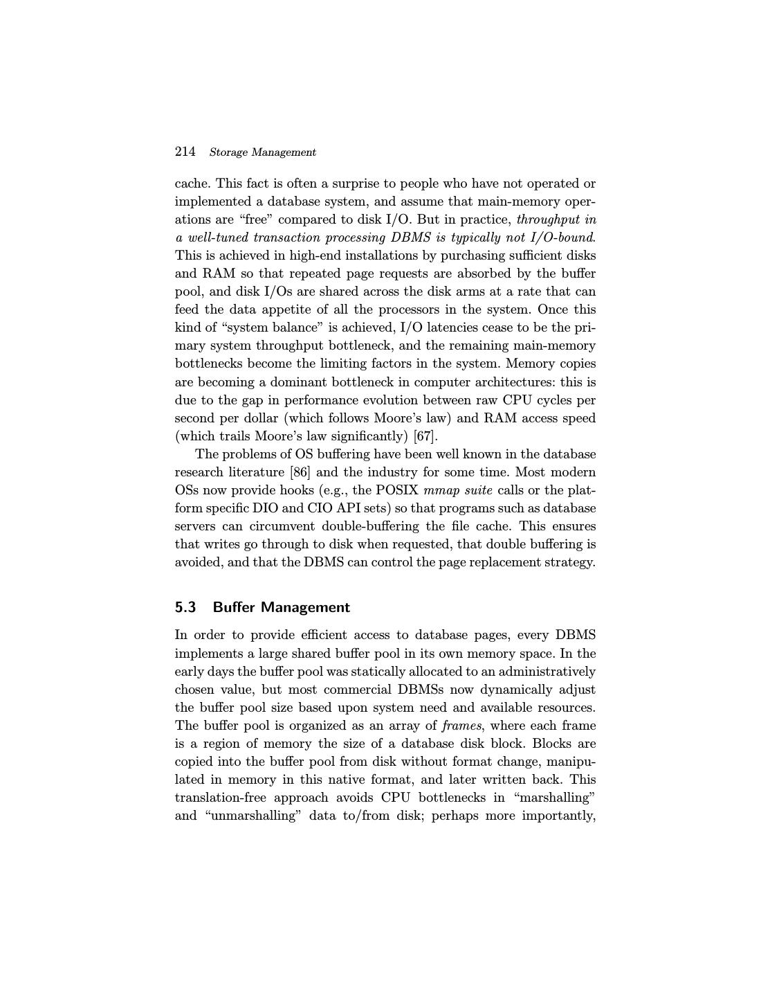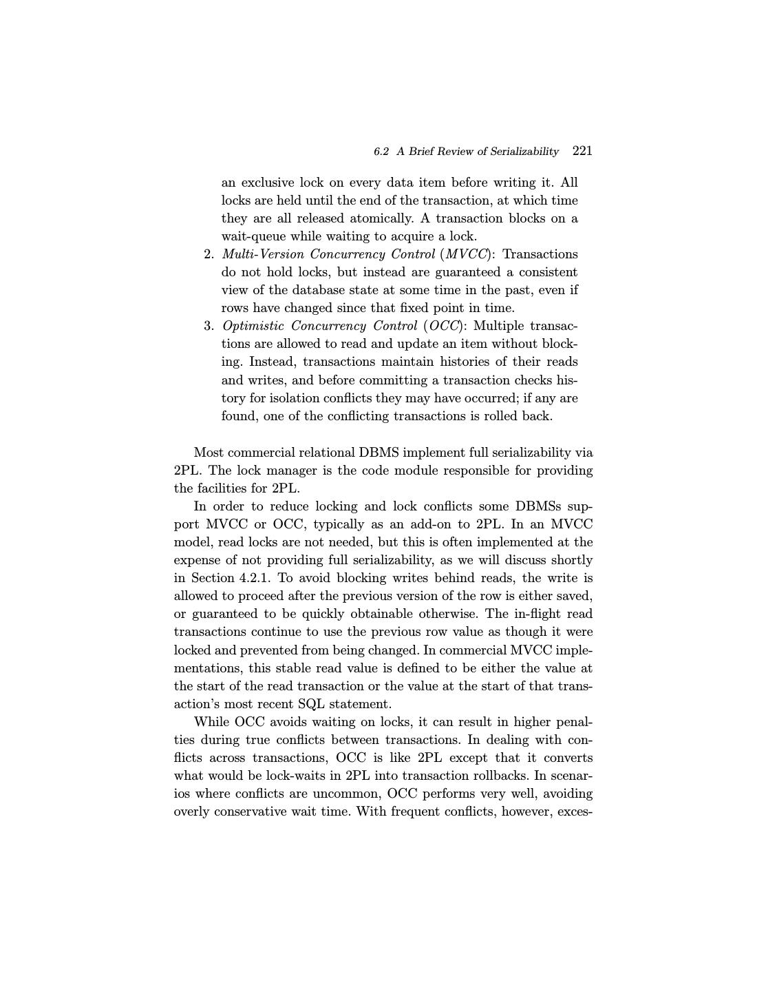 19 . 2.2 DBMS Threads 159 in the near future rather than relying on the OS communications buffers. Lock table: The lock table is shared by all DBMS workers and is used by the Lock Manager (Section 6.3) to implement database lock- ing semantics. The techniques for sharing the lock table are the same as those of the buffer pool and these same techniques can be used to support any other shared data structures needed by the DBMS implementation. 2.2 DBMS Threads The previous section provided a simplified description of DBMS process models. We assumed the availability of high-performance OS threads and that the DBMS would target only uniprocessor systems. In the remainder of this section, we relax the first of those assumptions and describe the impact on DBMS implementations. Multi-processing and parallelism are discussed in the next section. 2.2.1 DBMS Threads Most of today’s DBMSs have their roots in research systems from the 1970s and commercialization efforts from the 1980s. Standard OS fea- tures that we take for granted today were often unavailable to DBMS developers when the original database systems were built. Efficient, high-scale OS thread support is perhaps the most significant of these. It was not until the 1990s that OS threads were widely implemented and, where they did exist, the implementations varied greatly. Even today, some OS thread implementations do not scale well enough to support all DBMS workloads well [31, 48, 93, 94]. Hence for legacy, portability, and scalability reasons, many widely used DBMS do not depend upon OS threads in their implementa- tions. Some avoid threads altogether and use the process per DBMS worker or the process pool model. Those implementing the remaining process model choice, the thread per DBMS worker model, need a solu- tion for those OS without good kernel thread implementations. One means of addressing this problem adopted by several leading DBMSs