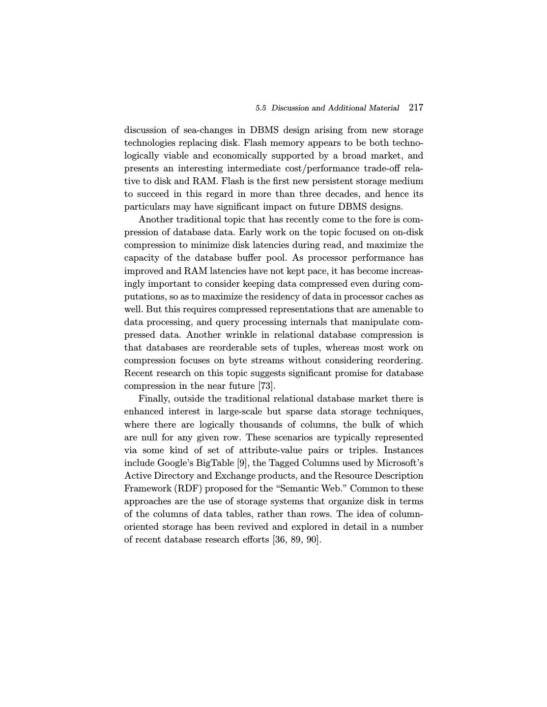 8 .148 Introduction 1.2 Scope and Overview In most of this paper, our focus is on architectural fundamentals sup- porting core database functionality. We do not attempt to provide a comprehensive review of database algorithmics that have been exten- sively documented in the literature. We also provide only minimal dis- cussion of many extensions present in modern DBMSs, most of which provide features beyond core data management but do not significantly alter the system architecture. However, within the various sections of this paper we note topics of interest that are beyond the scope of the paper, and where possible we provide pointers to additional reading. We begin our discussion with an investigation of the overall archi- tecture of database systems. The first topic in any server system archi- tecture is its overall process structure, and we explore a variety of viable alternatives on this front, first for uniprocessor machines and then for the variety of parallel architectures available today. This discussion of core server system architecture is applicable to a variety of systems, but was to a large degree pioneered in DBMS design. Following this, we begin on the more domain-specific components of a DBMS. We start with a single query’s view of the system, focusing on the relational query processor. Following that, we move into the storage architecture and transactional storage management design. Finally, we present some of the shared components and utilities that exist in most DBMSs, but are rarely discussed in textbooks.