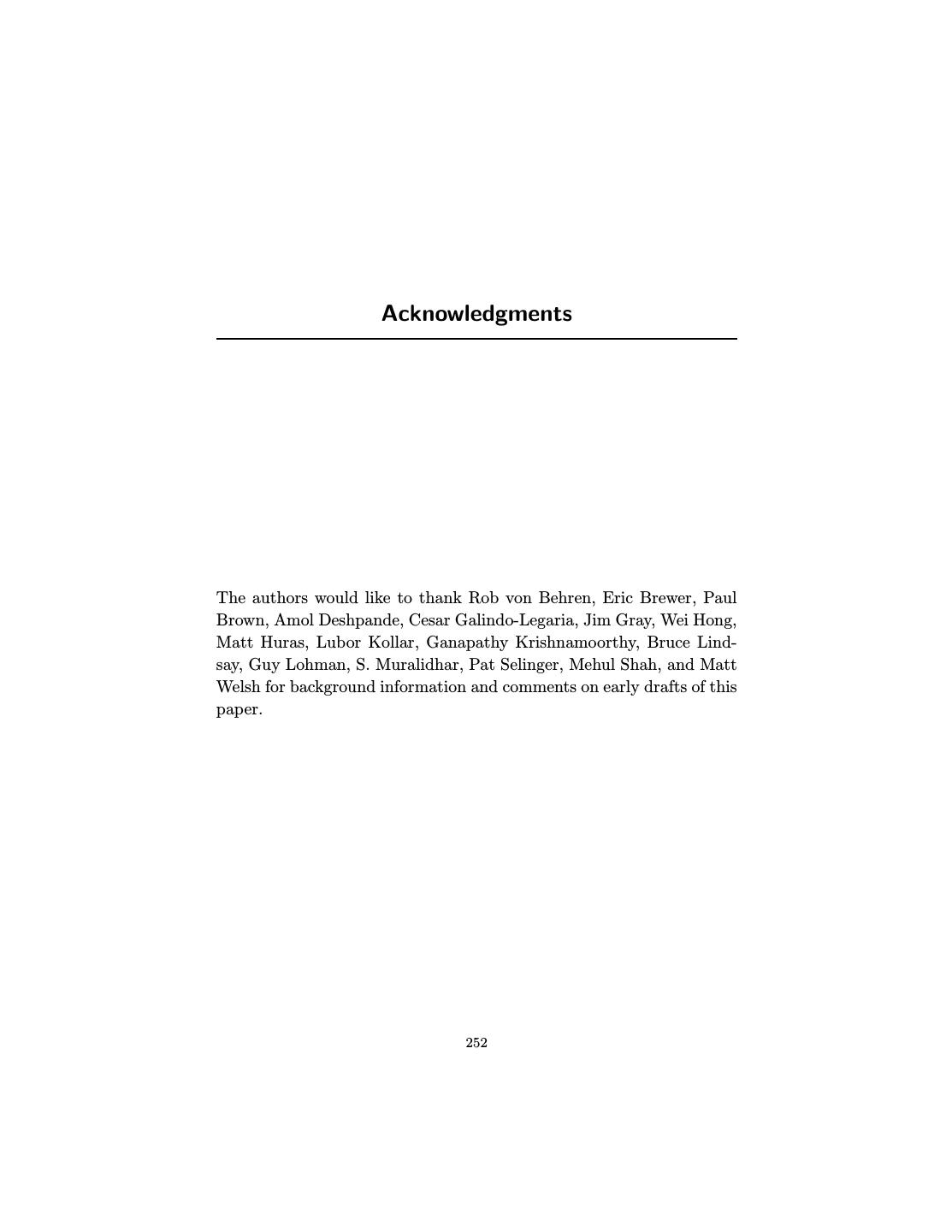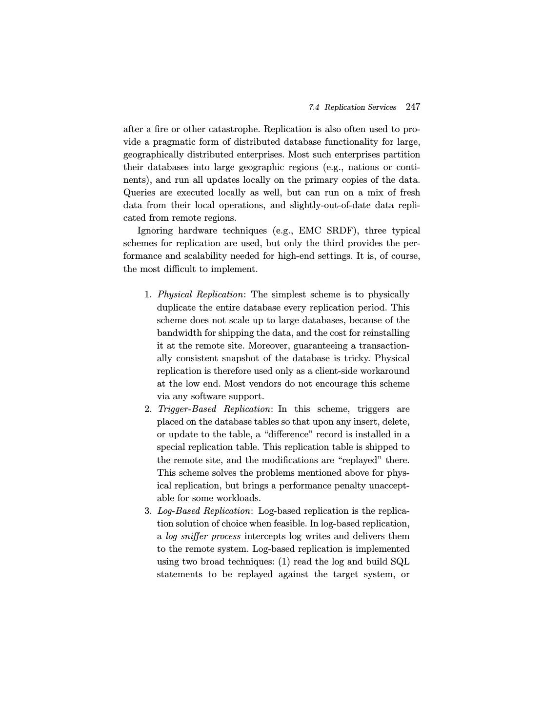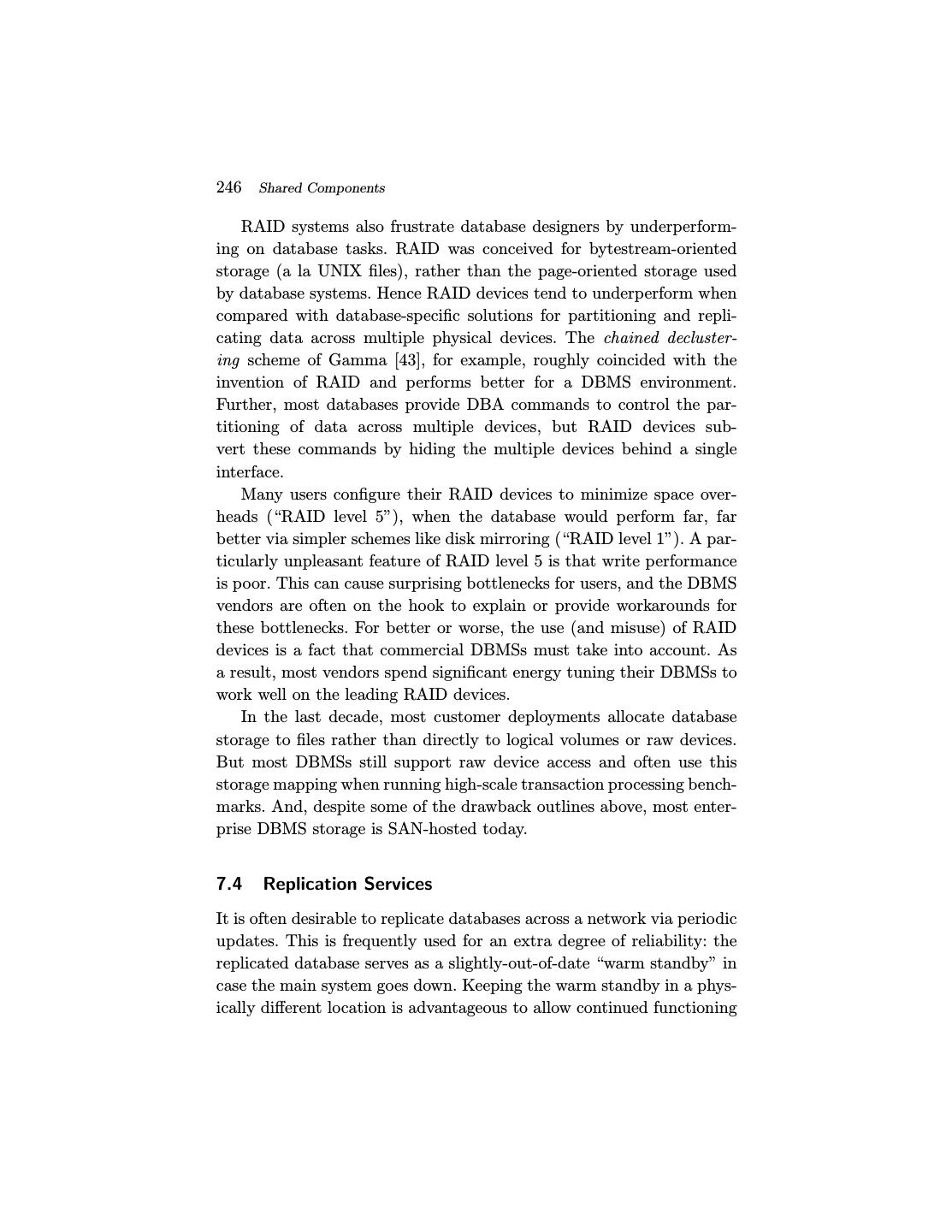 29 . 3.2 Shared-Nothing 169 processor typically results in shutdown of the entire machine, and hence the entire DBMS. In a shared-nothing system, the failure of a single node will not necessarily affect other nodes in the cluster. But it will certainly affect the overall behavior of the DBMS, since the failed node hosts some fraction of the data in the database. There are at least three possible approaches in this scenario. The first is to bring down all nodes if any node fails; this in essence emulates what would hap- pen in a shared-memory system. The second approach, which Informix dubbed “Data Skip,” allows queries to be executed on any nodes that are up, “skipping” the data on the failed node. This is useful in sce- narios where data availability is more important than completeness of results. But best-effort results do not have well-defined semantics, and for many workloads this is not a useful choice — particularly because the DBMS is often used as the “repository of record” in a multi-tier system, and availability-vs-consistency trade-offs tend to get done in a higher tier (often in an application server). The third approach is to employ redundancy schemes ranging from full database failover (requir- ing double the number of machines and software licenses) to fine-grain redundancy like chained declustering [43]. In this latter technique, tuple copies are spread across multiple nodes in the cluster. The advantage of chained declustering over simpler schemes is that (a) it requires fewer machines to be deployed to guarantee availability than na¨ıve schemes, and (b) when a node does fails, the system load is distributed fairly evenly over the remaining nodes: the n − 1 remaining nodes each do n/(n − 1) of the original work, and this form of linear degrada- tion in performance continues as nodes fail. In practice, most current generation commercial systems are somewhere in the middle, nei- ther as coarse-grained as full database redundancy nor as fine-grained as chained declustering The shared-nothing architecture is fairly common today, and has unbeatable scalability and cost characteristics. It is mostly used at the extreme high end, typically for decision-support applications and data warehouses. In an interesting combination of hardware architectures, a shared-nothing cluster is often made up of many nodes each of which is a shared-memory multi-processors.