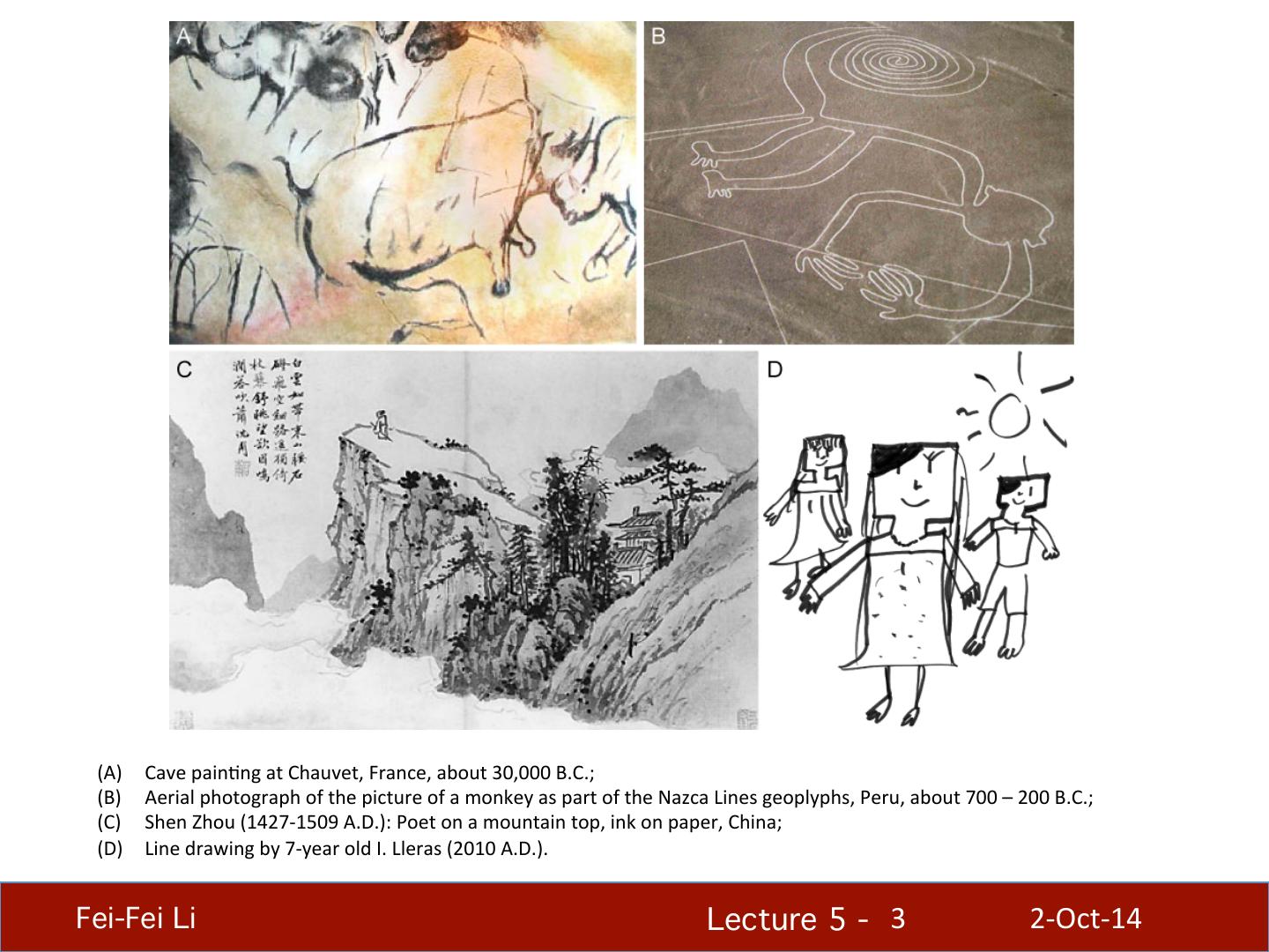 3 . (A) Cave pain.ng at Chauvet, France, about 30,000 B.C.; (B) Aerial photograph of the picture of a monkey as part of the Nazca Lines geoplyphs, Peru, about 700 – 200 B.C.; (C) Shen Zhou (1427-‐1509 A.D.): Poet on a mountain top, ink on paper, China; (D) Line drawing by 7-‐year old I. Lleras (2010 A.D.). Fei-Fei Li! Lecture 5 - !3 2-‐Oct-‐14