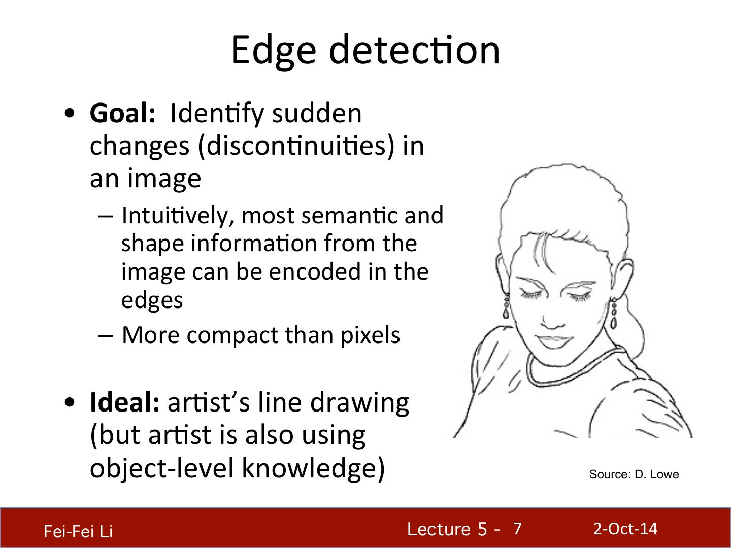 7 . Edge detec.on • Goal: Iden.fy sudden changes (discon.nui.es) in an image – Intui.vely, most seman.c and shape informa.on from the image can be encoded in the edges – More compact than pixels • Ideal: ar.st’s line drawing (but ar.st is also using object-‐level knowledge) Source: D. Lowe Fei-Fei Li! Lecture 5 - !7 2-‐Oct-‐14