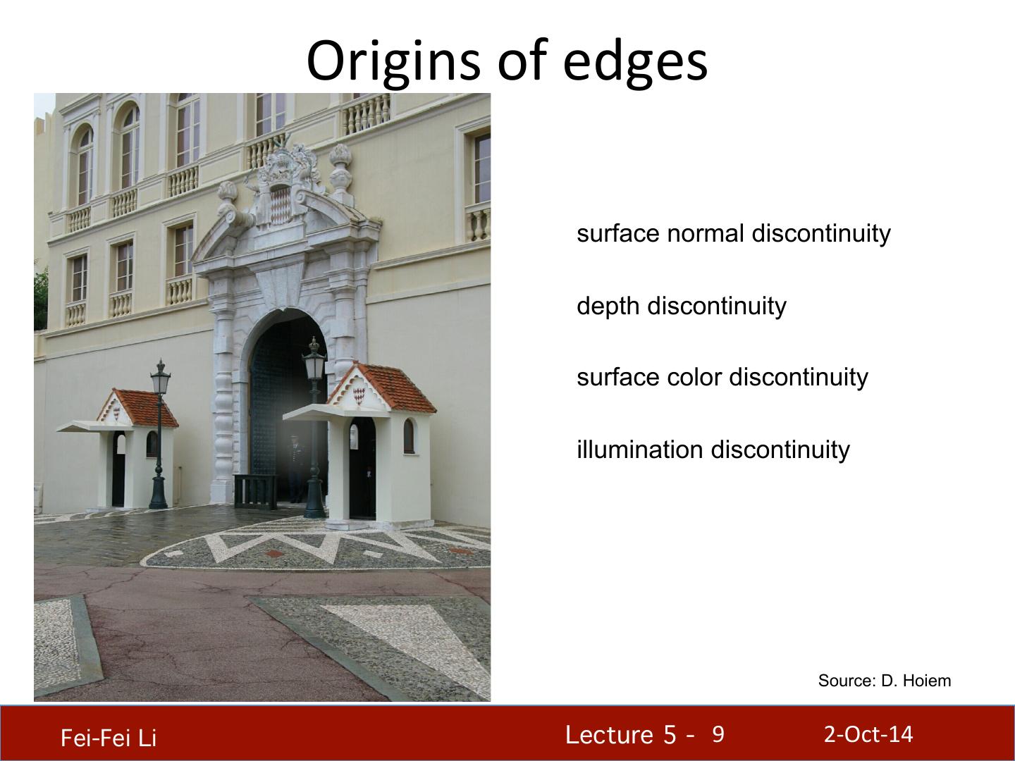 9 . Origins of edges surface normal discontinuity depth discontinuity surface color discontinuity illumination discontinuity Source: D. Hoiem Fei-Fei Li! Lecture 5 - !9 2-‐Oct-‐14