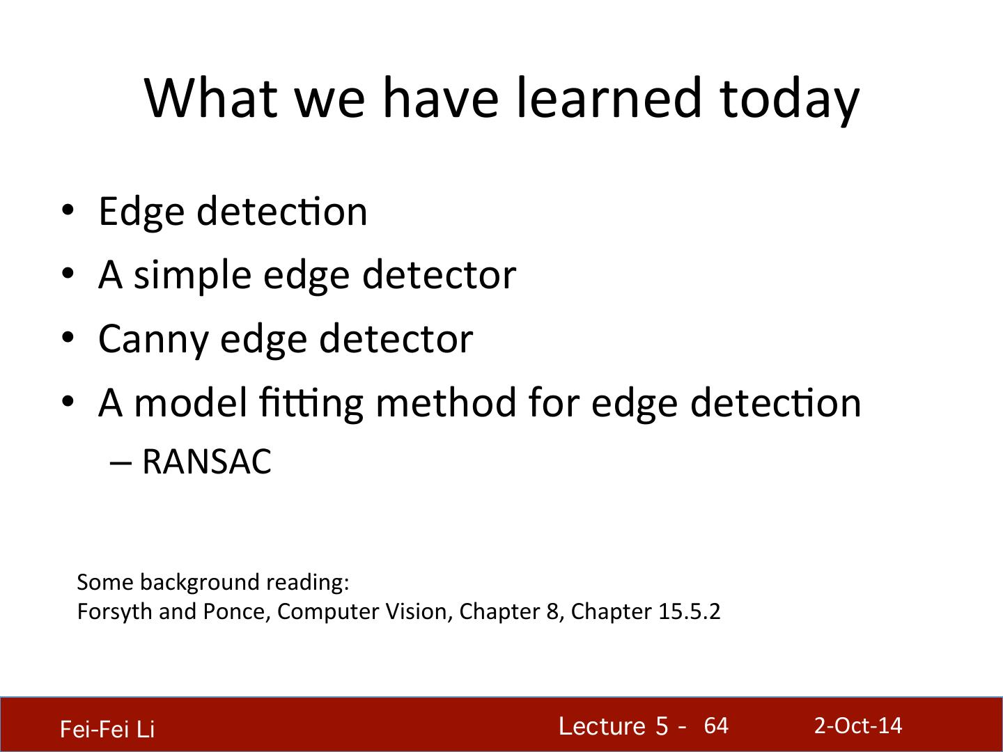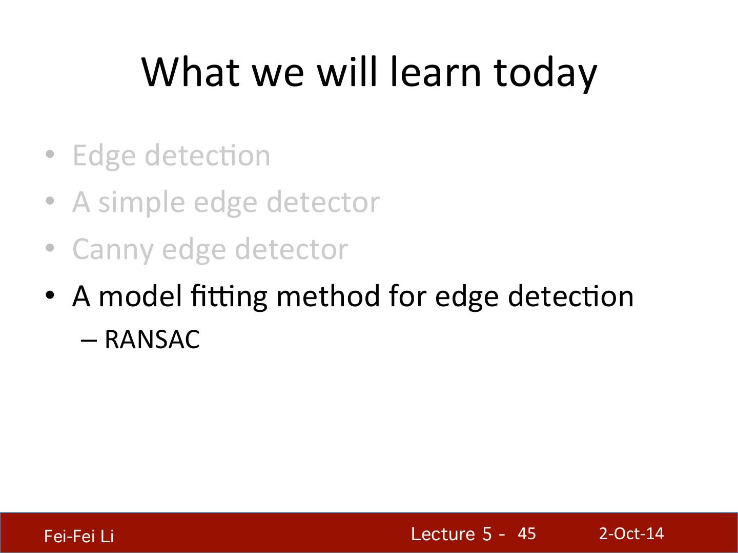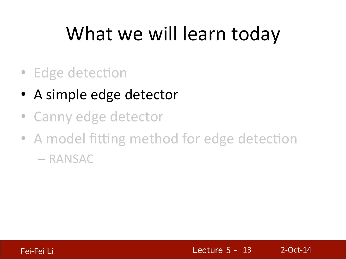 13 . What we will learn today • Edge detec.on • A simple edge detector • Canny edge detector • A model fiIng method for edge detec.on – RANSAC Fei-Fei Li! Lecture 5 - !13 2-‐Oct-‐14