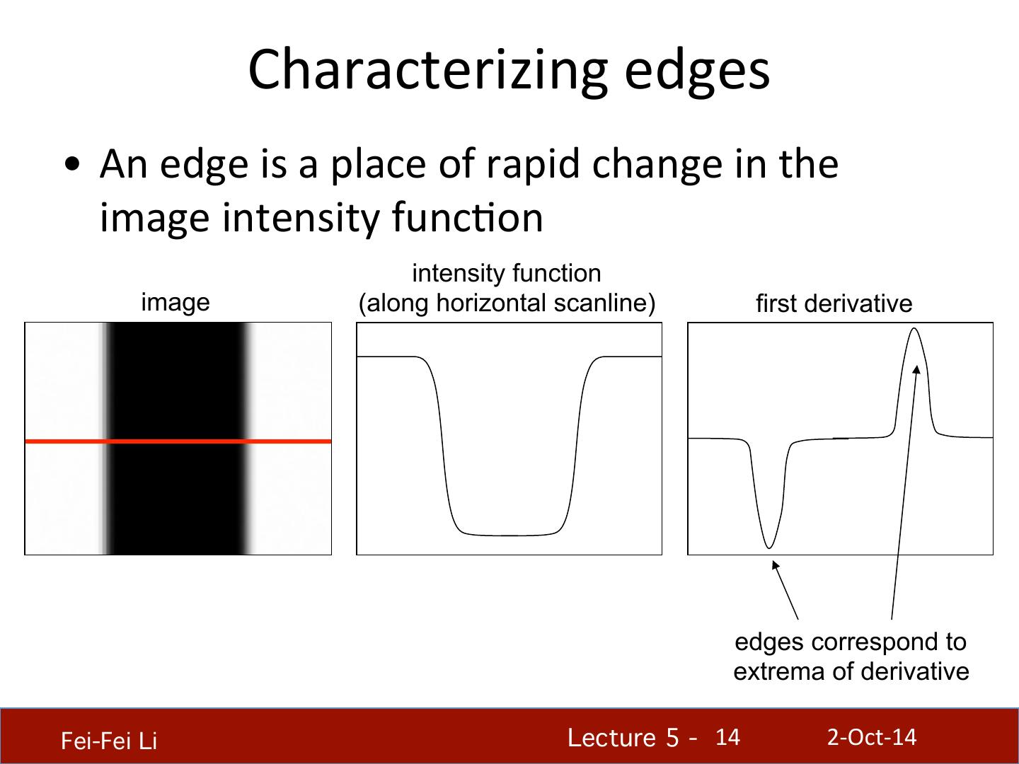 14 . Characterizing edges • An edge is a place of rapid change in the image intensity func.on intensity function image (along horizontal scanline) first derivative edges correspond to extrema of derivative Fei-Fei Li! Lecture 5 - !14 2-‐Oct-‐14