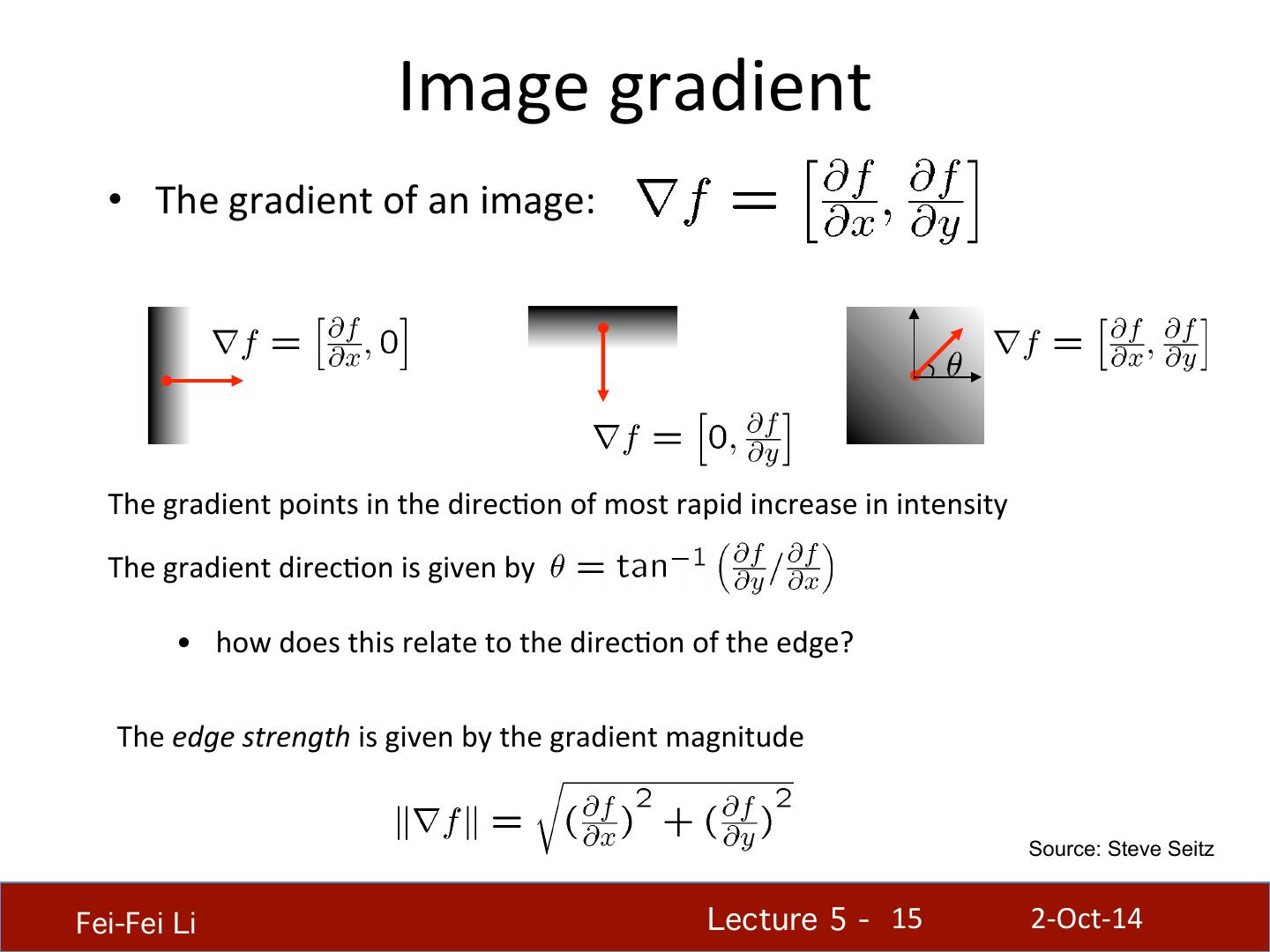 15 . Image gradient • The gradient of an image: The gradient points in the direc.on of most rapid increase in intensity The gradient direc.on is given by • how does this relate to the direc.on of the edge? The edge strength is given by the gradient magnitude Source: Steve Seitz Fei-Fei Li! Lecture 5 - !15 2-‐Oct-‐14