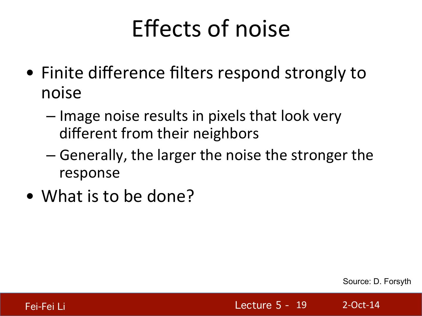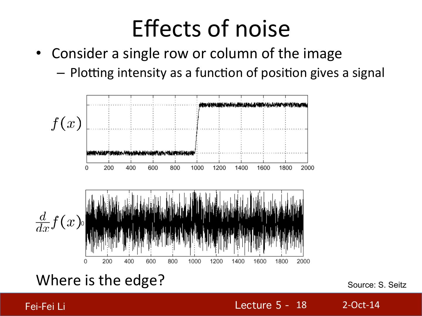 18 . Effects of noise • Consider a single row or column of the image – PloIng intensity as a func.on of posi.on gives a signal Where is the edge? Source: S. Seitz Fei-Fei Li! Lecture 5 - !18 2-‐Oct-‐14