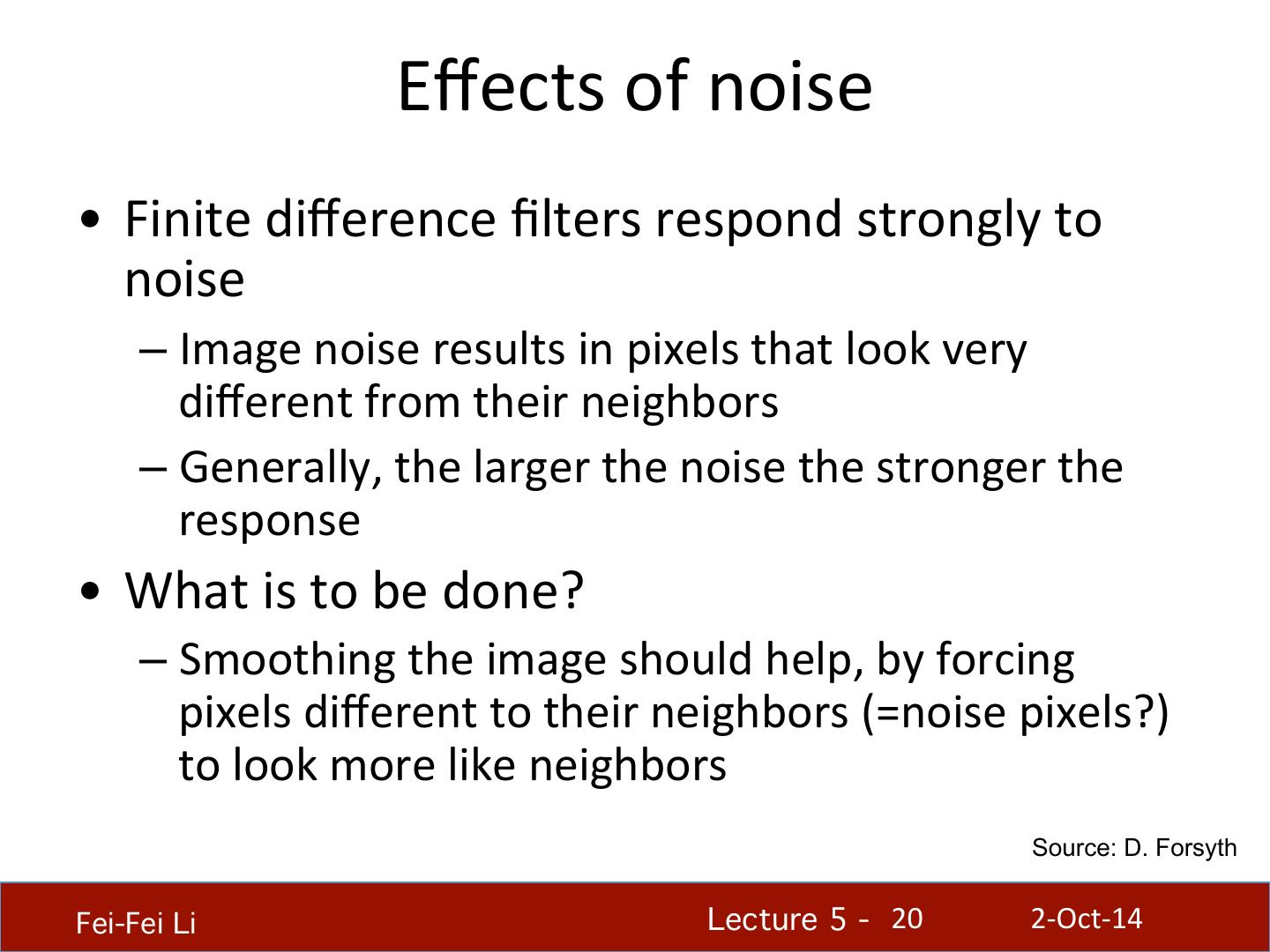 19 . Effects of noise • Finite difference filters respond strongly to noise – Image noise results in pixels that look very different from their neighbors – Generally, the larger the noise the stronger the response • What is to be done? – Smoothing the image should help, by forcing pixels different to their neighbors (=noise pixels?) to look more like neighbors Source: D. Forsyth Fei-Fei Li! Lecture 5 - !19 2-‐Oct-‐14