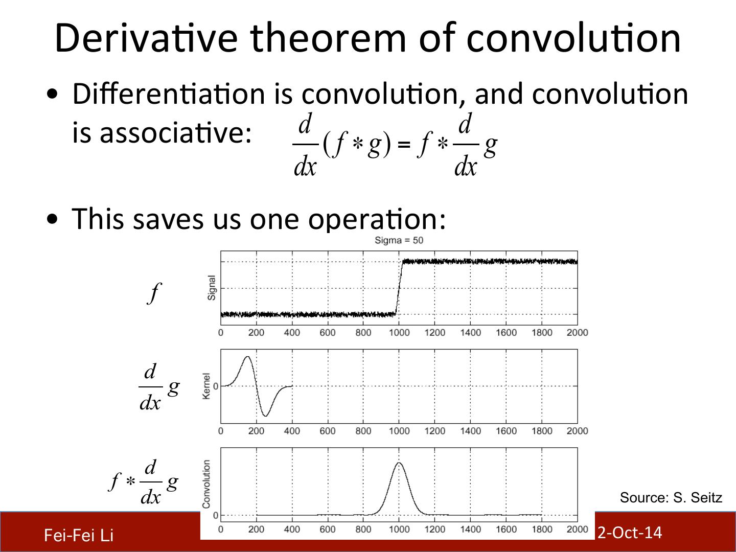 21 . Solu.on: smooth first f g f*g d ( f ∗ g) dx d • To find edges, look for peaks in ( f ∗ g) dx Source: S. Seitz Fei-Fei Li! Lecture 5 - !21 2-‐Oct-‐14