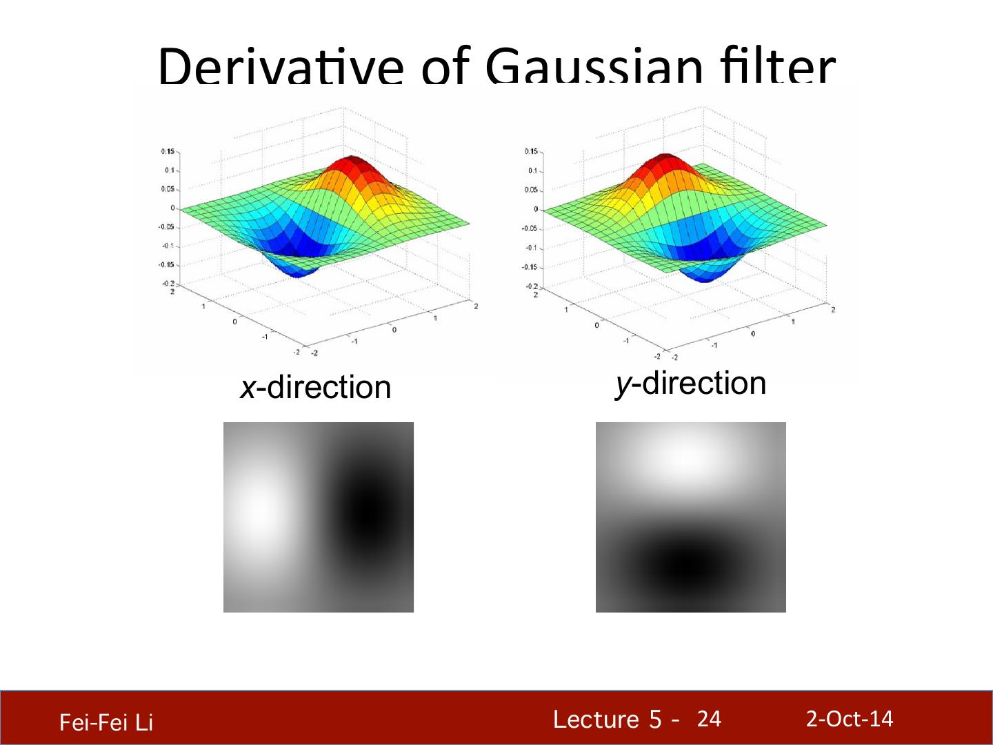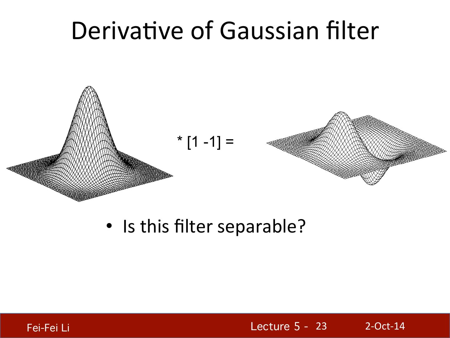 23 . Deriva.ve of Gaussian filter * [1 -1] = • Is this filter separable? Fei-Fei Li! Lecture 5 - !23 2-‐Oct-‐14