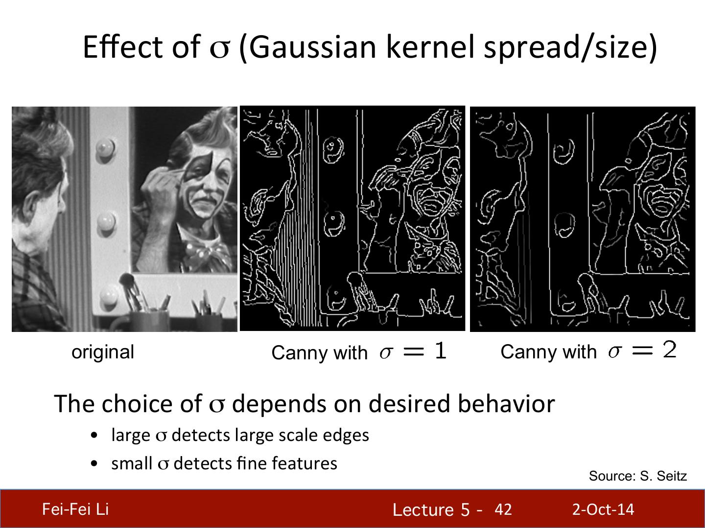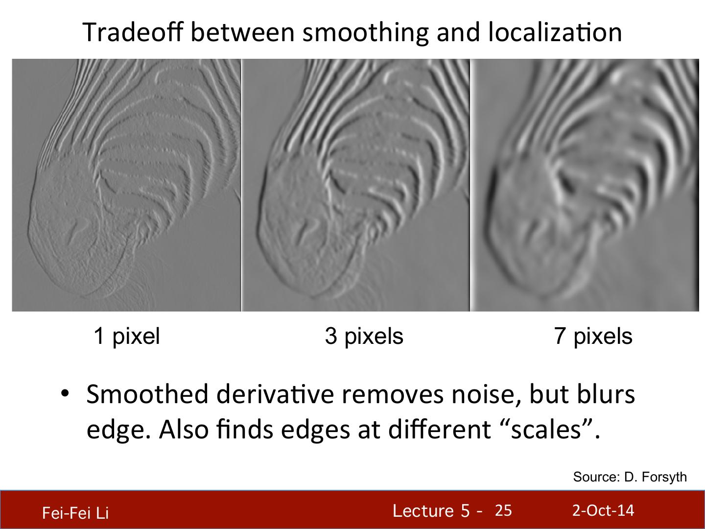 25 . Tradeoff between smoothing and localiza.on 1 pixel 3 pixels 7 pixels • Smoothed deriva.ve removes noise, but blurs edge. Also finds edges at different “scales”. Source: D. Forsyth Fei-Fei Li! Lecture 5 - !25 2-‐Oct-‐14