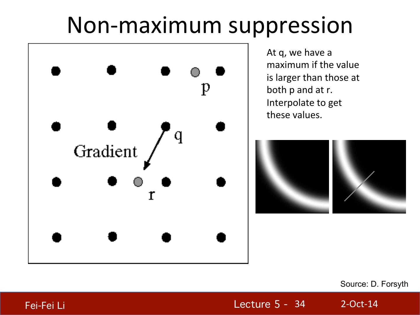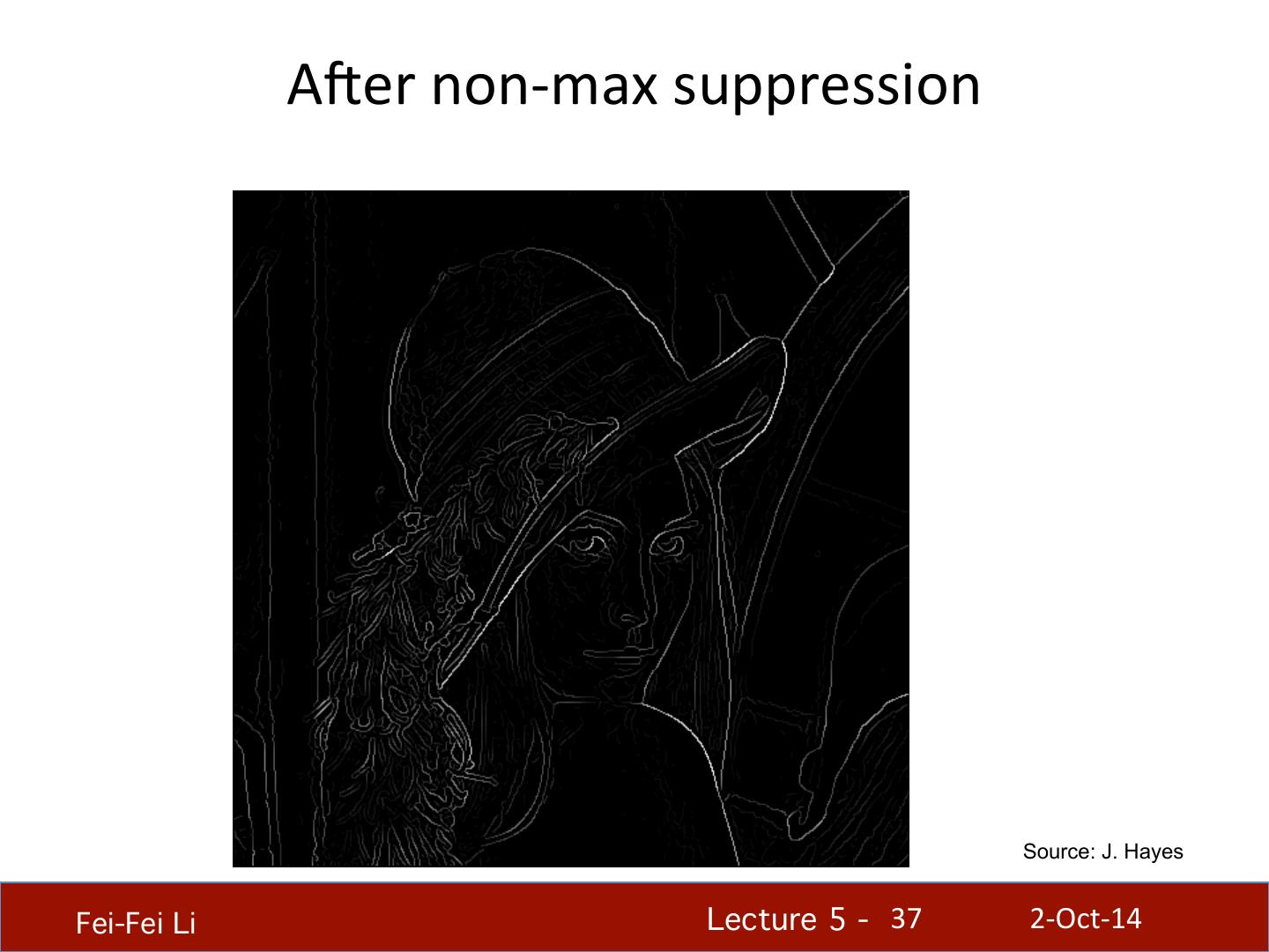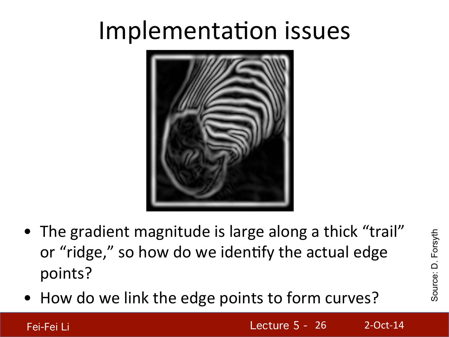 26 . Implementa.on issues • The gradient magnitude is large along a thick “trail” Source: D. Forsyth or “ridge,” so how do we iden.fy the actual edge points? • How do we link the edge points to form curves? Fei-Fei Li! Lecture 5 - !26 2-‐Oct-‐14