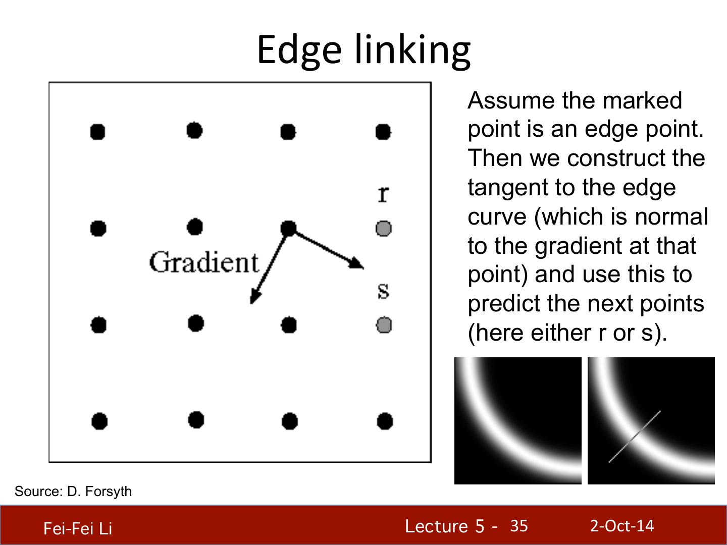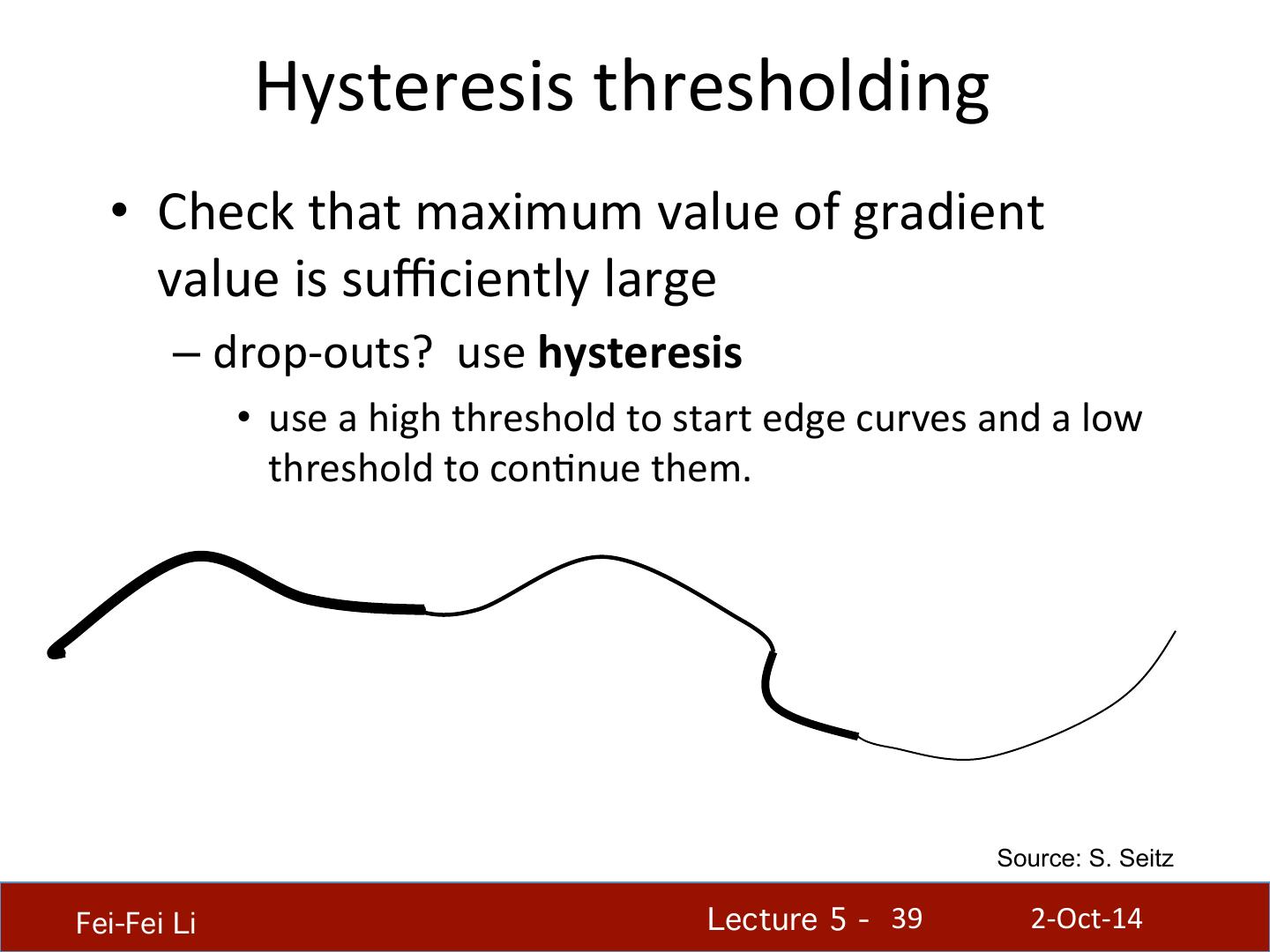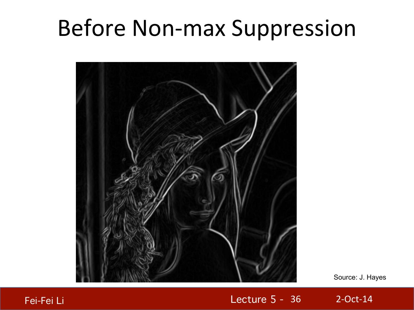 26 . Implementa.on issues • The gradient magnitude is large along a thick “trail” Source: D. Forsyth or “ridge,” so how do we iden.fy the actual edge points? • How do we link the edge points to form curves? Fei-Fei Li! Lecture 5 - !26 2-‐Oct-‐14