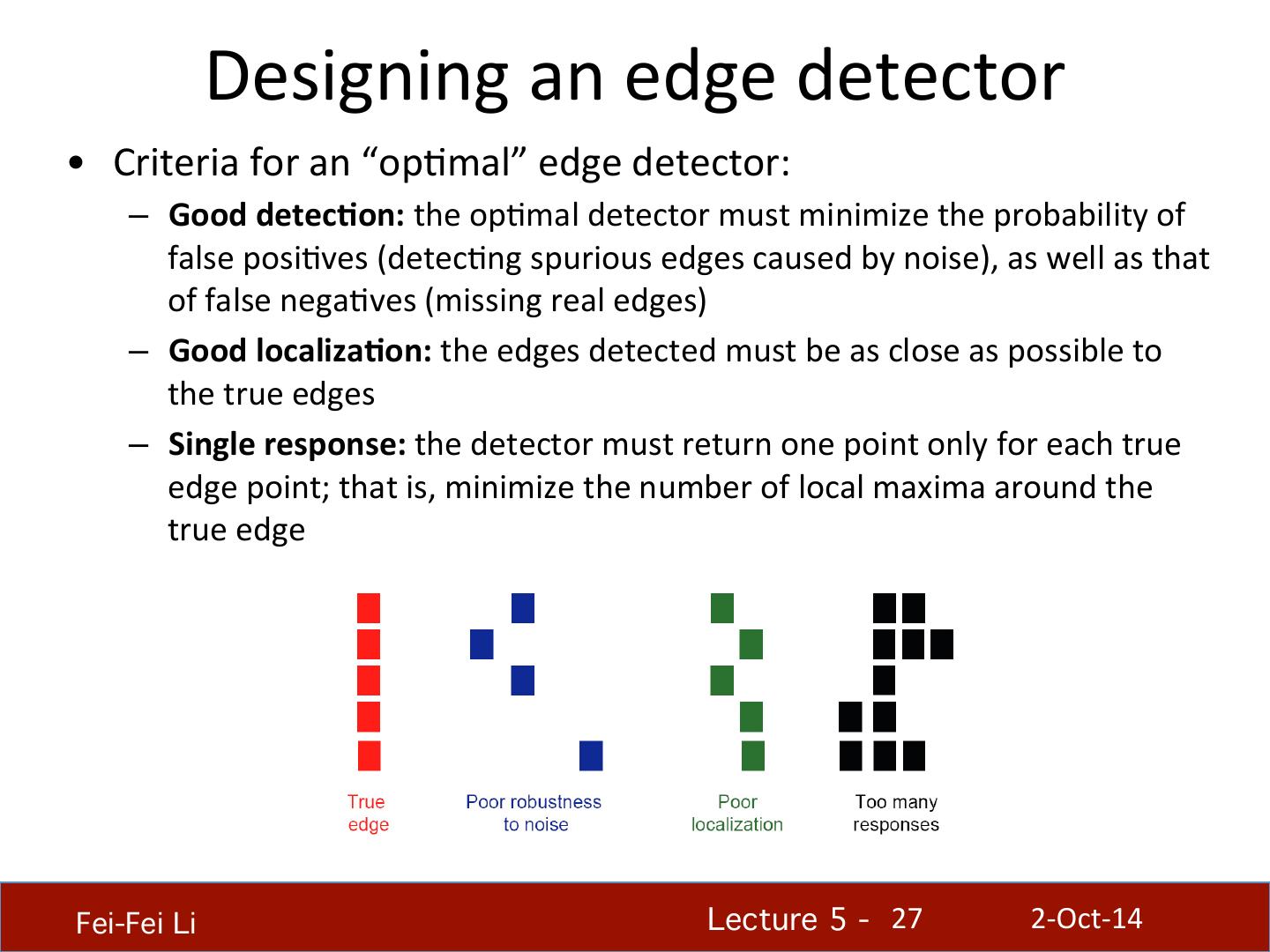 27 . Designing an edge detector • Criteria for an “op.mal” edge detector: – Good detec,on: the op.mal detector must minimize the probability of false posi.ves (detec.ng spurious edges caused by noise), as well as that of false nega.ves (missing real edges) – Good localiza,on: the edges detected must be as close as possible to the true edges – Single response: the detector must return one point only for each true edge point; that is, minimize the number of local maxima around the true edge Fei-Fei Li! Lecture 5 - !27 2-‐Oct-‐14