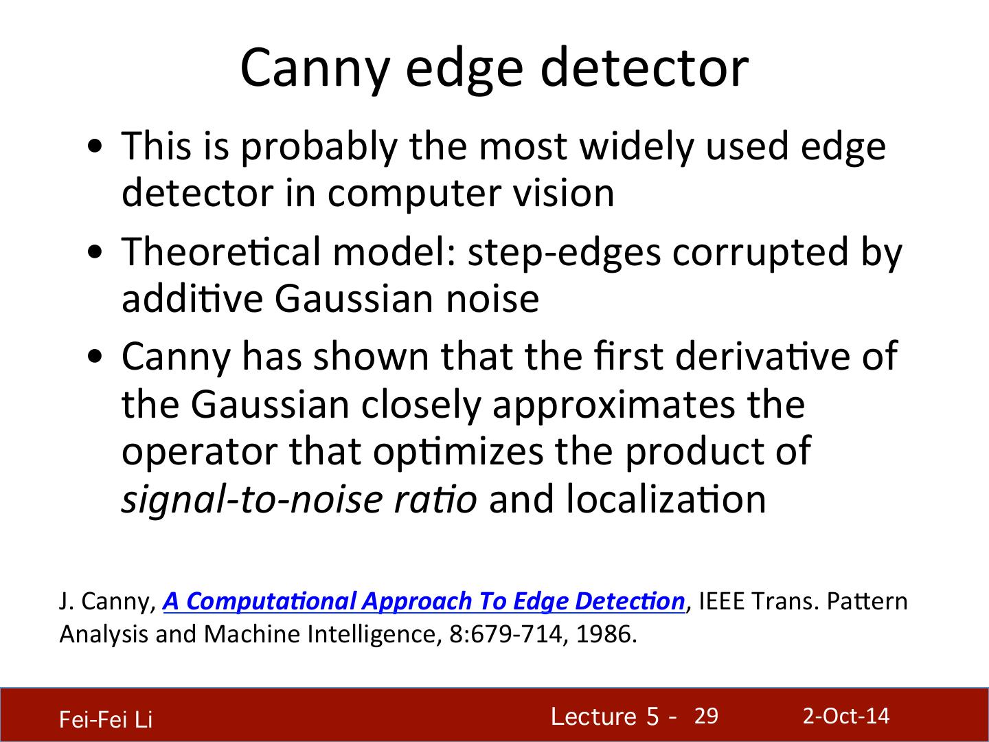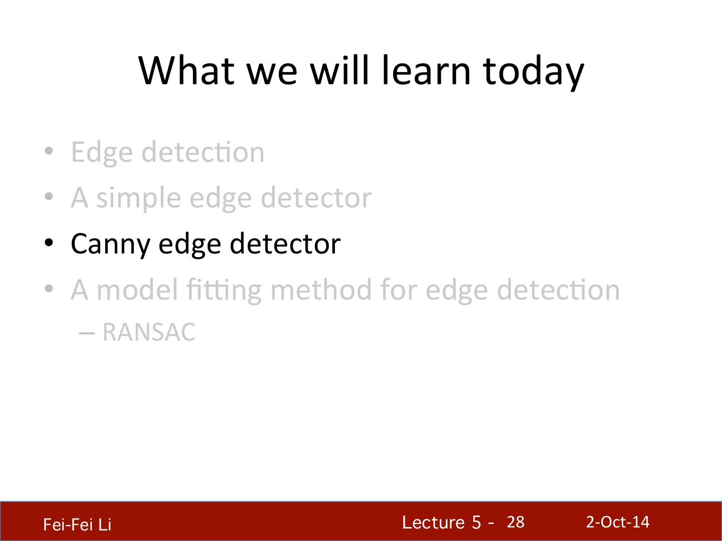 28 . What we will learn today • Edge detec.on • A simple edge detector • Canny edge detector • A model fiIng method for edge detec.on – RANSAC Fei-Fei Li! Lecture 5 - !28 2-‐Oct-‐14