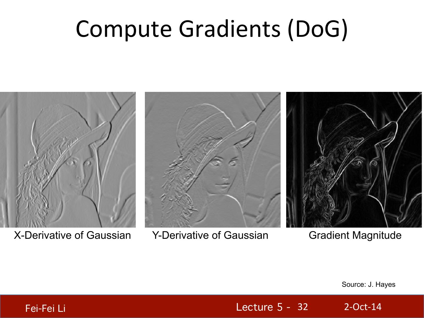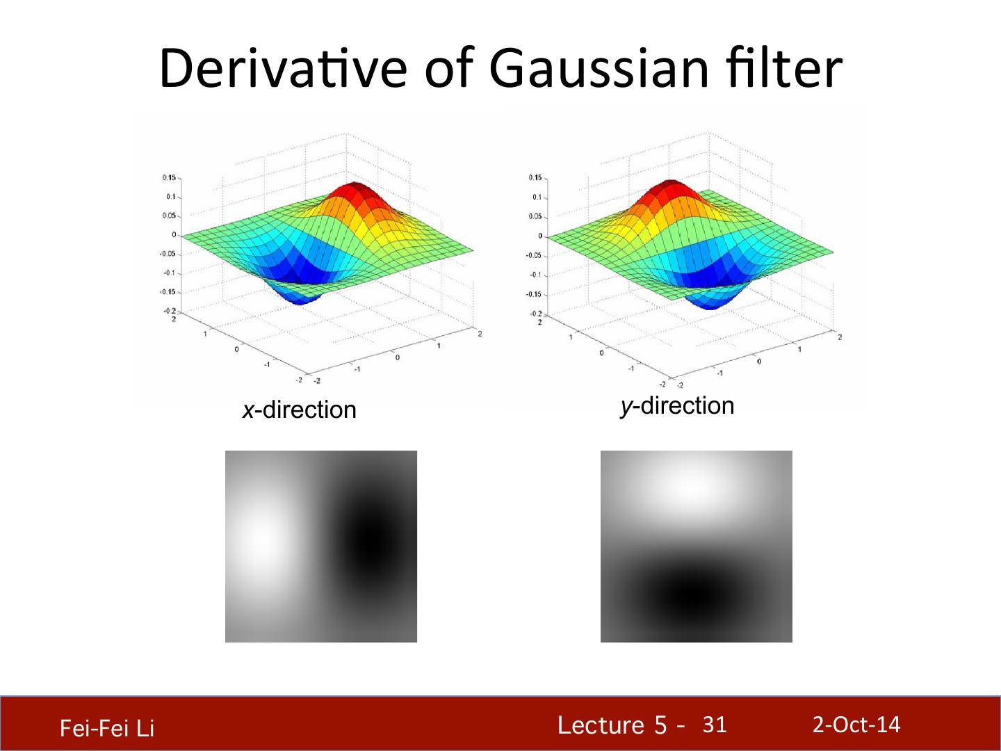 24 . Deriva.ve of Gaussian filter x-direction y-direction Fei-Fei Li! Lecture 5 - !24 2-‐Oct-‐14
