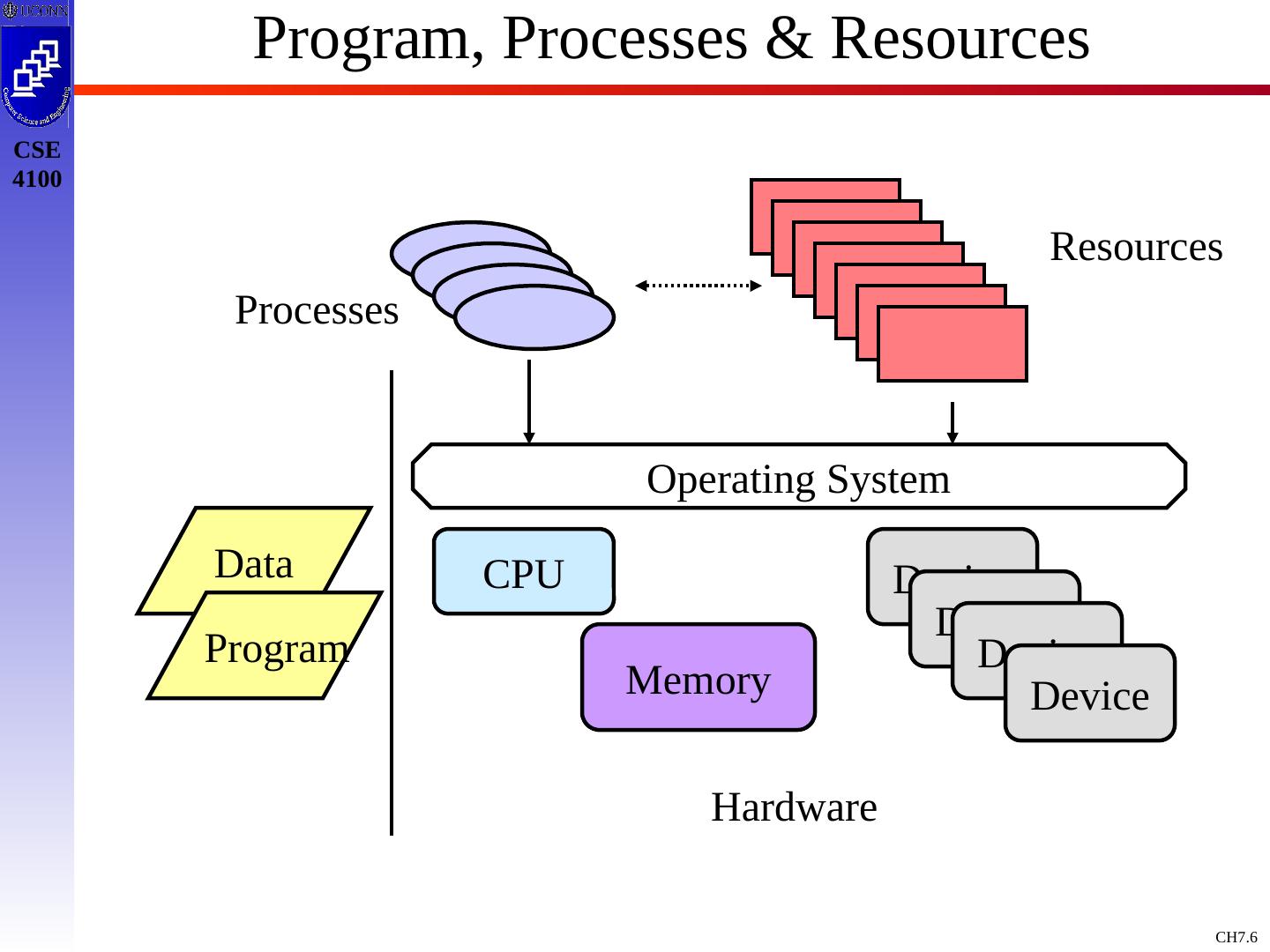 6 .Program, Processes & Resources Processes Resources CPU Memory Device Device Device Device Operating System Hardware Data Program