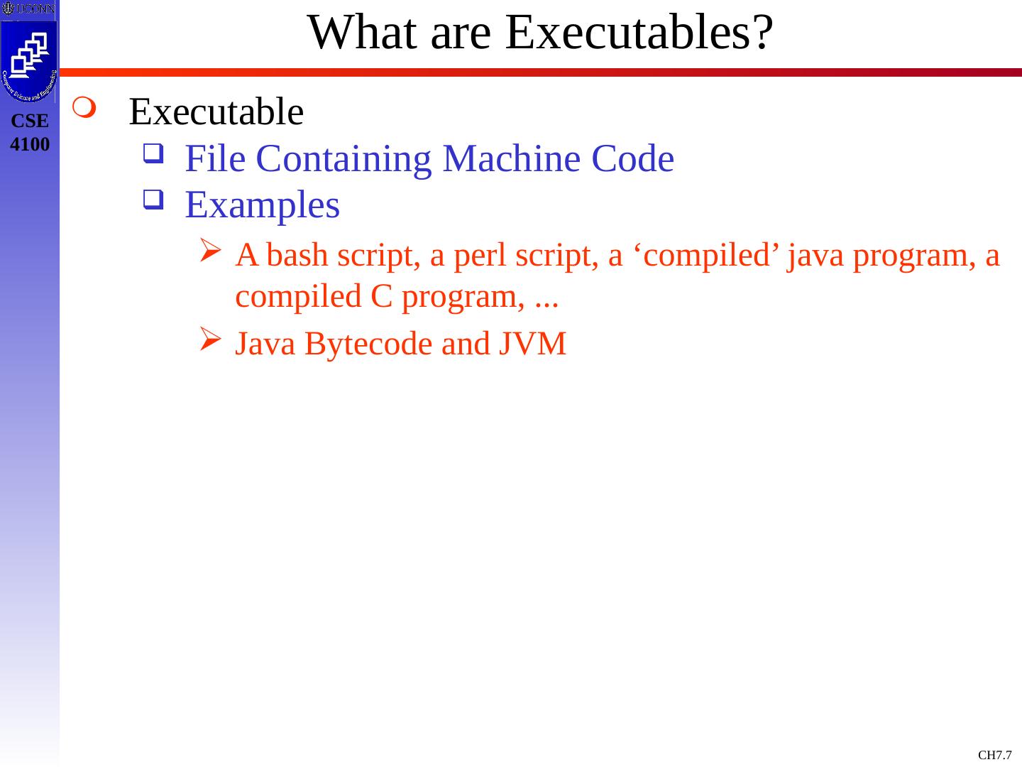 7 .What are Executables? Executable File Containing Machine Code Examples A bash script, a perl script, a ‘compiled’ java program, a compiled C program, ... Java Bytecode and JVM