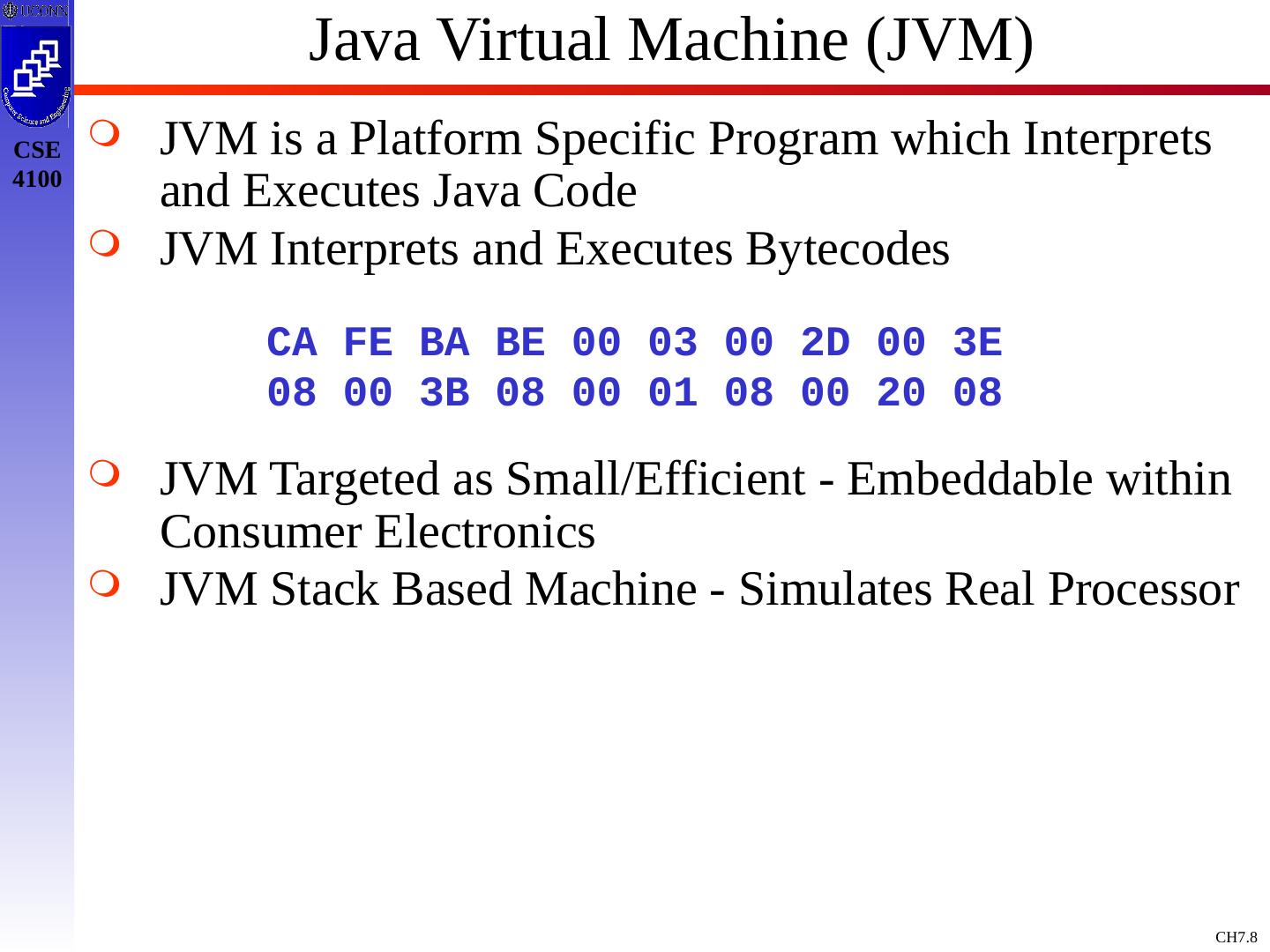8 .Java Virtual Machine (JVM) JVM is a Platform Specific Program which Interprets and Executes Java Code JVM Interprets and Executes Bytecodes JVM Targeted as Small/Efficient - Embeddable within Consumer Electronics JVM Stack Based Machine - Simulates Real Processor CA FE BA BE 00 03 00 2D 00 3E 08 00 3B 08 00 01 08 00 20 08