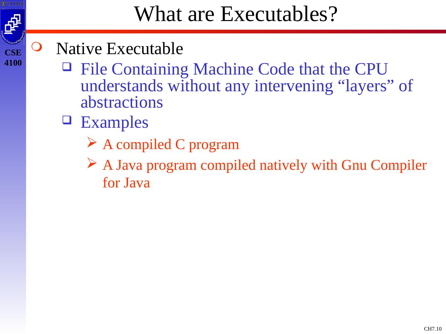 10 .What are Executables? Native Executable File Containing Machine Code that the CPU understands without any intervening “layers” of abstractions Examples A compiled C program A Java program compiled natively with Gnu Compiler for Java