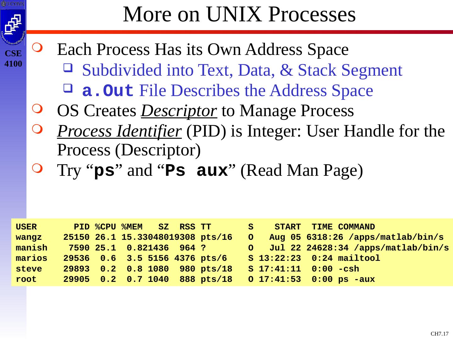 17 .More on UNIX Processes Each Process Has its Own Address Space Subdivided into Text, Data, & Stack Segment a.Out File Describes the Address Space OS Creates Descriptor to Manage Process Process Identifier (PID) is Integer: User Handle for the Process (Descriptor) Try “ ps ” and “ Ps aux ” (Read Man Page) USER PID %CPU %MEM SZ RSS TT S START TIME COMMAND wangz 25150 26.1 15.33048019308 pts/16 O Aug 05 6318:26 /apps/matlab/bin/s manish 7590 25.1 0.821436 964 ? O Jul 22 24628:34 /apps/matlab/bin/s marios 29536 0.6 3.5 5156 4376 pts/6 S 13:22:23 0:24 mailtool steve 29893 0.2 0.8 1080 980 pts/18 S 17:41:11 0:00 -csh root 29905 0.2 0.7 1040 888 pts/18 O 17:41:53 0:00 ps -aux