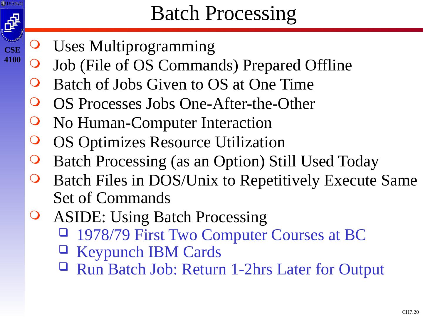 20 .Batch Processing Uses Multiprogramming Job (File of OS Commands) Prepared Offline Batch of Jobs Given to OS at One Time OS Processes Jobs One-After-the-Other No Human-Computer Interaction OS Optimizes Resource Utilization Batch Processing (as an Option) Still Used Today Batch Files in DOS/Unix to Repetitively Execute Same Set of Commands ASIDE: Using Batch Processing 1978/79 First Two Computer Courses at BC Keypunch IBM Cards Run Batch Job: Return 1-2hrs Later for Output