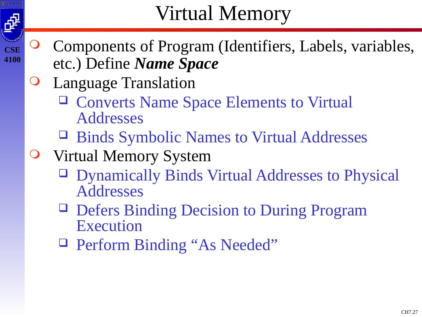 27 .Virtual Memory Components of Program (Identifiers, Labels, variables, etc.) Define Name Space Language Translation Converts Name Space Elements to Virtual Addresses Binds Symbolic Names to Virtual Addresses Virtual Memory System Dynamically Binds Virtual Addresses to Physical Addresses Defers Binding Decision to During Program Execution Perform Binding “As Needed”
